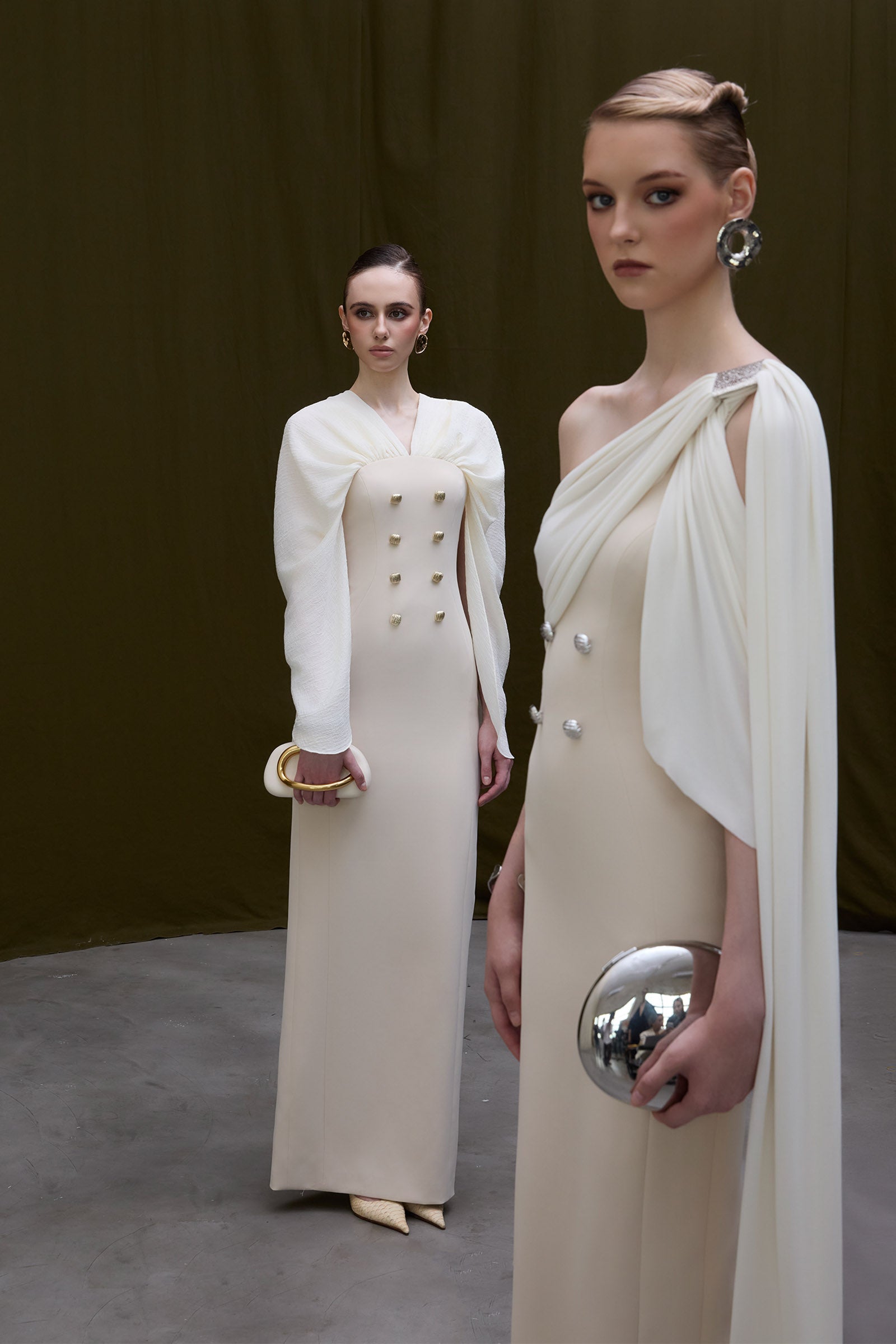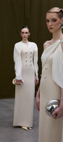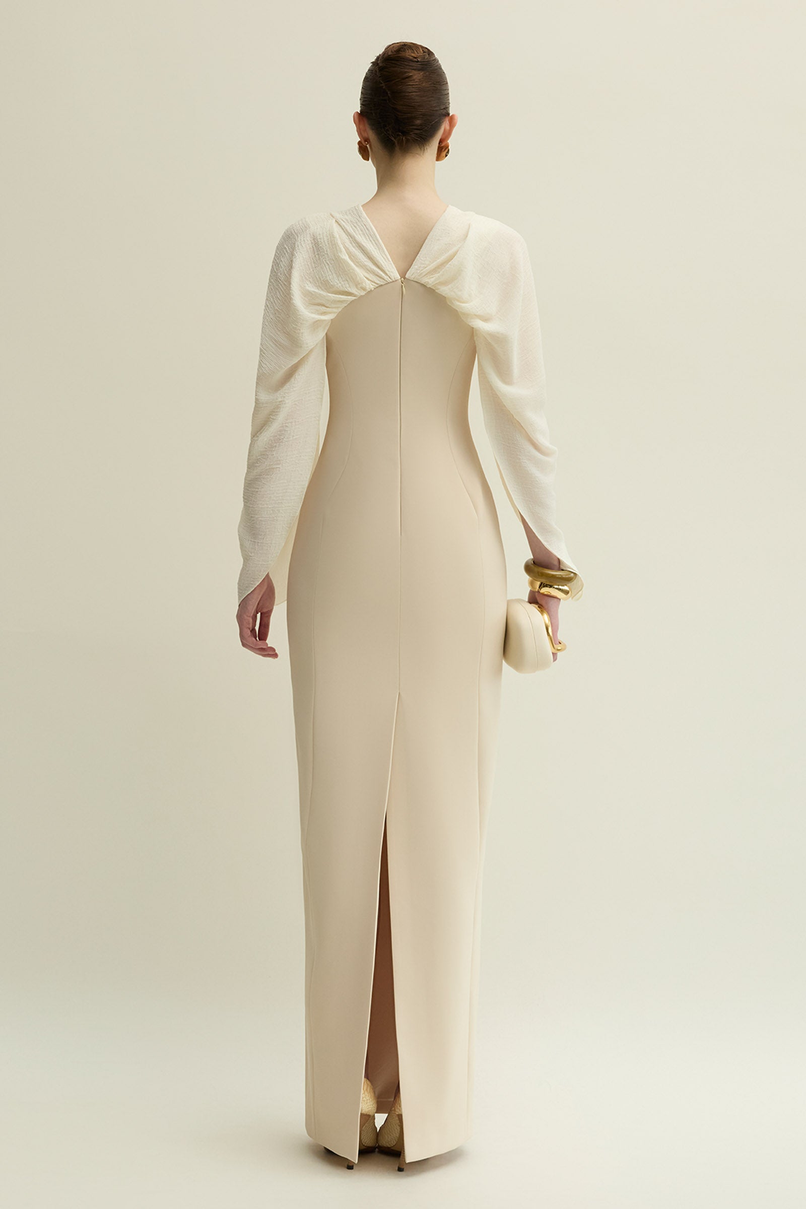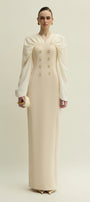 Expertly crafted from soft cotton, this sheath maxi dress features a draped V-neckline and elegant split sleeves, enhanced by subtle button embellishments. Its refined silhouette offers both sophistication and comfort, making it ideal for formal dinners, cocktail parties, or daytime celebrations.