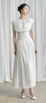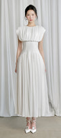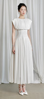 This dress features a flattering corset waist that sculpts the silhouette, paired with a delicate chiffon fabric draped elegantly across the chest. Its midi length and structured design offer a sophisticated balance of comfort and style, making it an ideal choice for formal occasions or refined everyday wear.