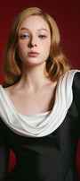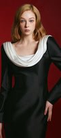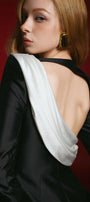 Waist dart, Two color contrast, Draped cowl neck detail, Asymmetric cut-out at the back