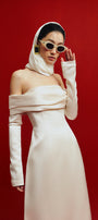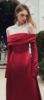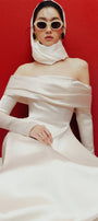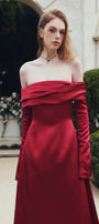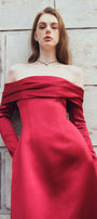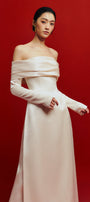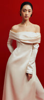Draped off-shoulder detail, Slit on the side, Waist dart