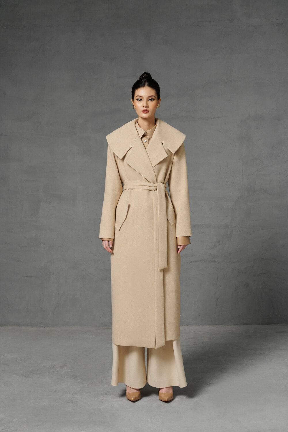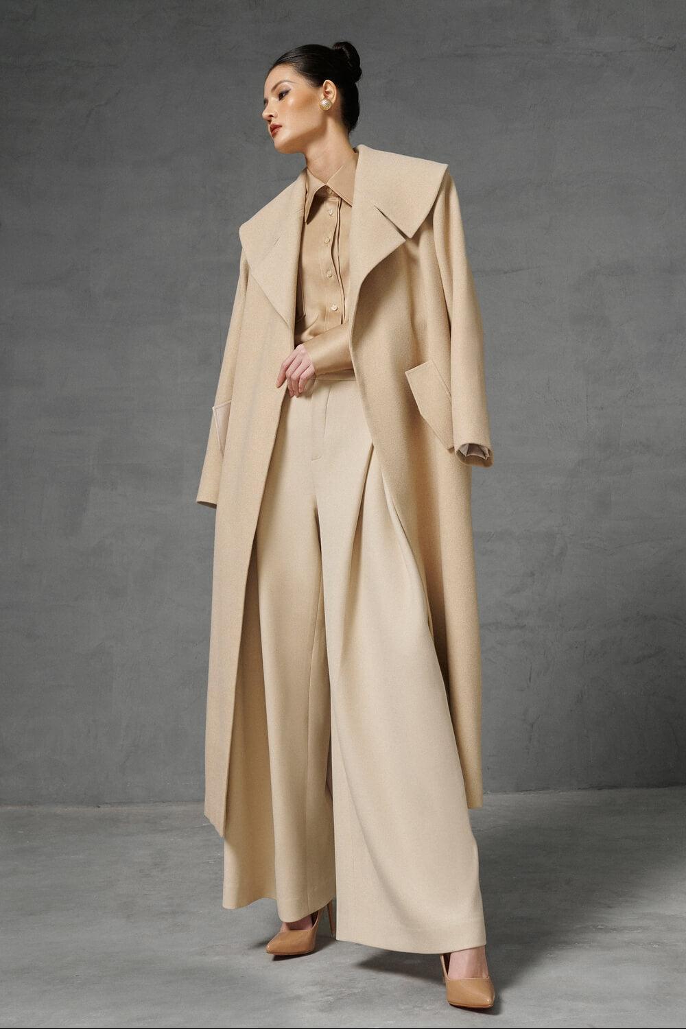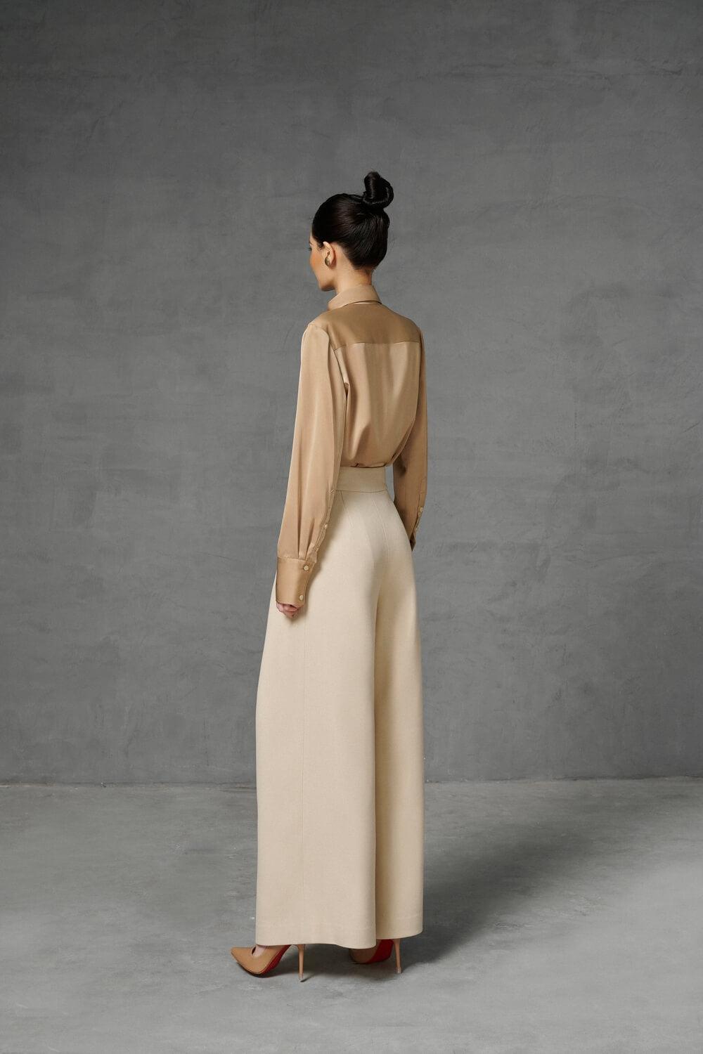 Designed with draped wide legs on a gentle beige tone which is very flattering to the wearer's skin the pants bring both youthfulness and elegance to the wearer. A unique design that created an eye-catching effect that easily capture all eyes.