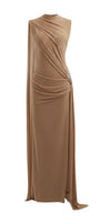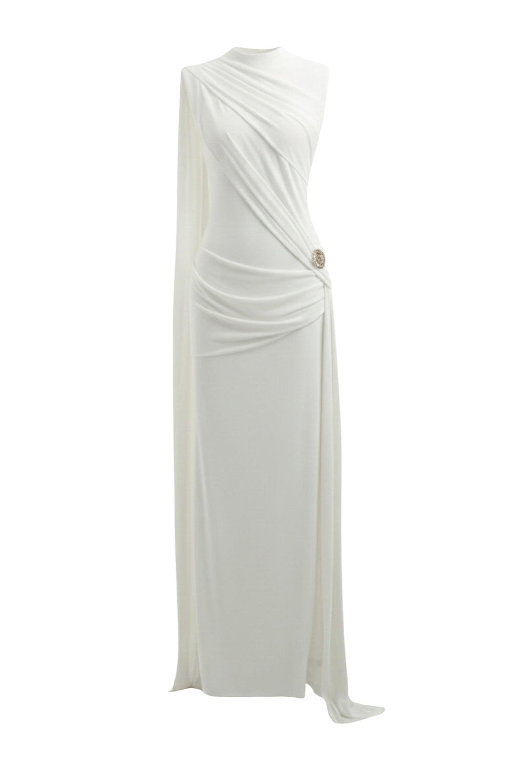 Elevate your wardrobe with this expert-crafted high neck sheath maxi dress. Constructed from premium cotton, it features asymmetric sleeves and a touch of metal embellishment for modern sophistication. Ideal for formal events, evening gatherings, and special occasions.