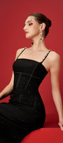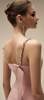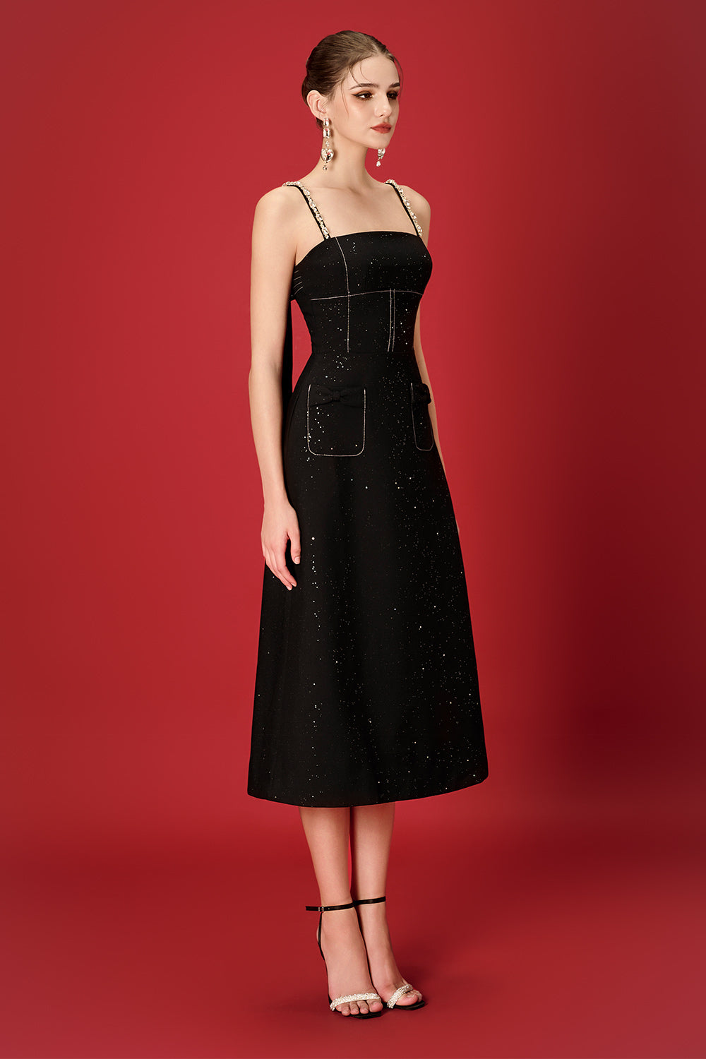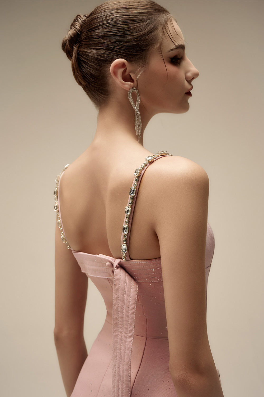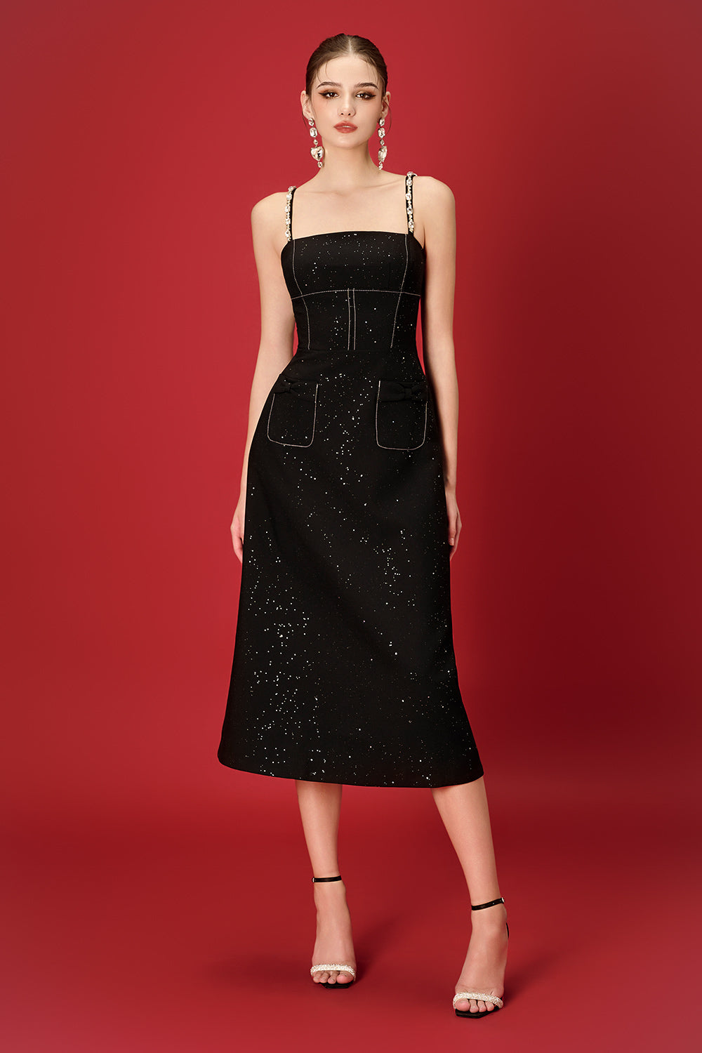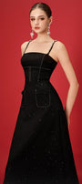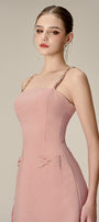 Special Features: Two patch pocket with bow, Attached rhinestone along the strap, Long matching color turnbuckle chest at the back, Corset waist design, Back dart, Back zipper
