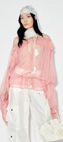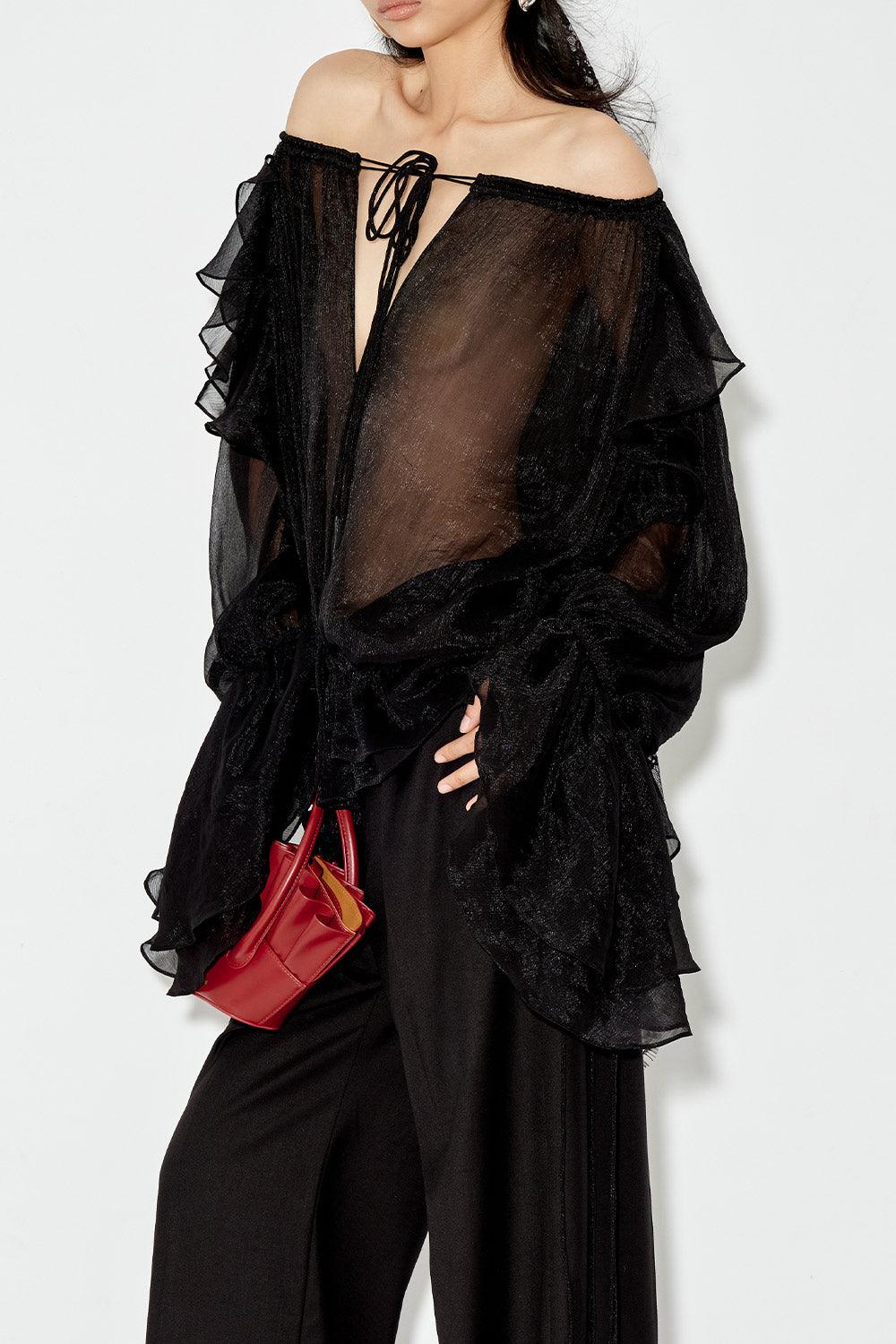 Flexible ruffle shoulder, See-through design, Gathered ruffle layer hem