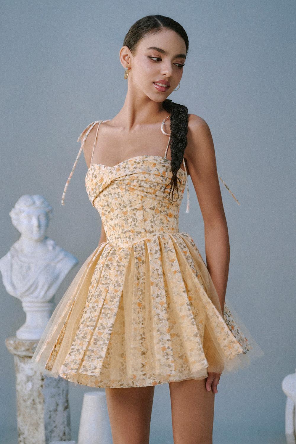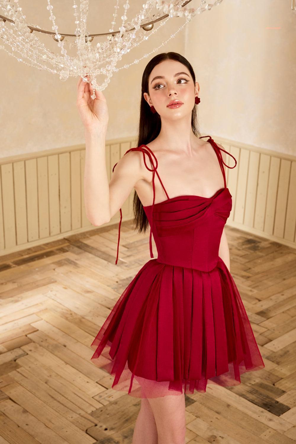 The exquisite pleating and delicate mesh details create a timeless and elegant silhouette, perfect for any occasion. Crafted with premium taffeta and designed with a flattering fit and flare shape, this dress will elevate your wardrobe and leave a lasting impression.