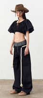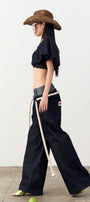These drop waist denim pants feature a floor-length design with a front zipper for easy wear and a modern silhouette. Crafted for a sleek, elongated look, they combine classic denim durability with contemporary style, making them a versatile addition to any wardrobe. Ideal for those seeking both comfort and a fashion-forward edge.