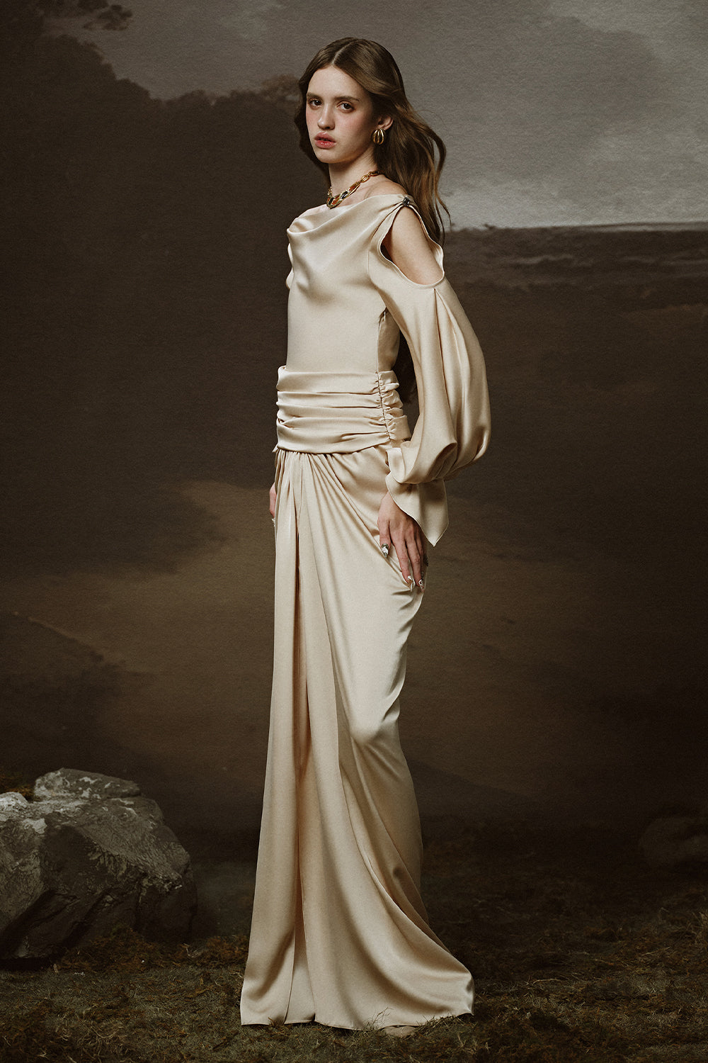 Chroma Sarong Asymmetric Neck Satin Floor Length Dress