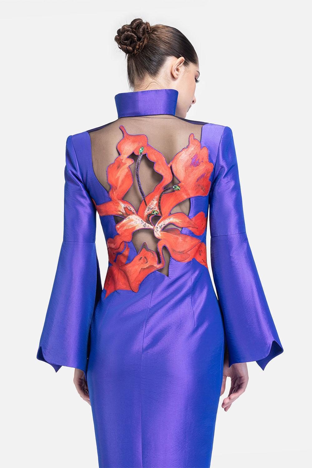 Experience elegance and exclusivity with this dress. The asymmetrical wavy neckline exudes sophistication, while the abstract hand-painted pattern makes it a work of art. Stand out from the crowd at your next evening event with this indigo taffeta dress.