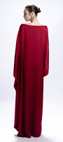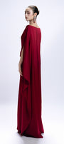 Expertly crafted from synthetic silk, this straight maxi dress features an elegant boat neck, split sleeves, and artful draping. Appliqué embellishments add refined detail. Perfect for evening events, cocktail parties, or wedding receptions.
