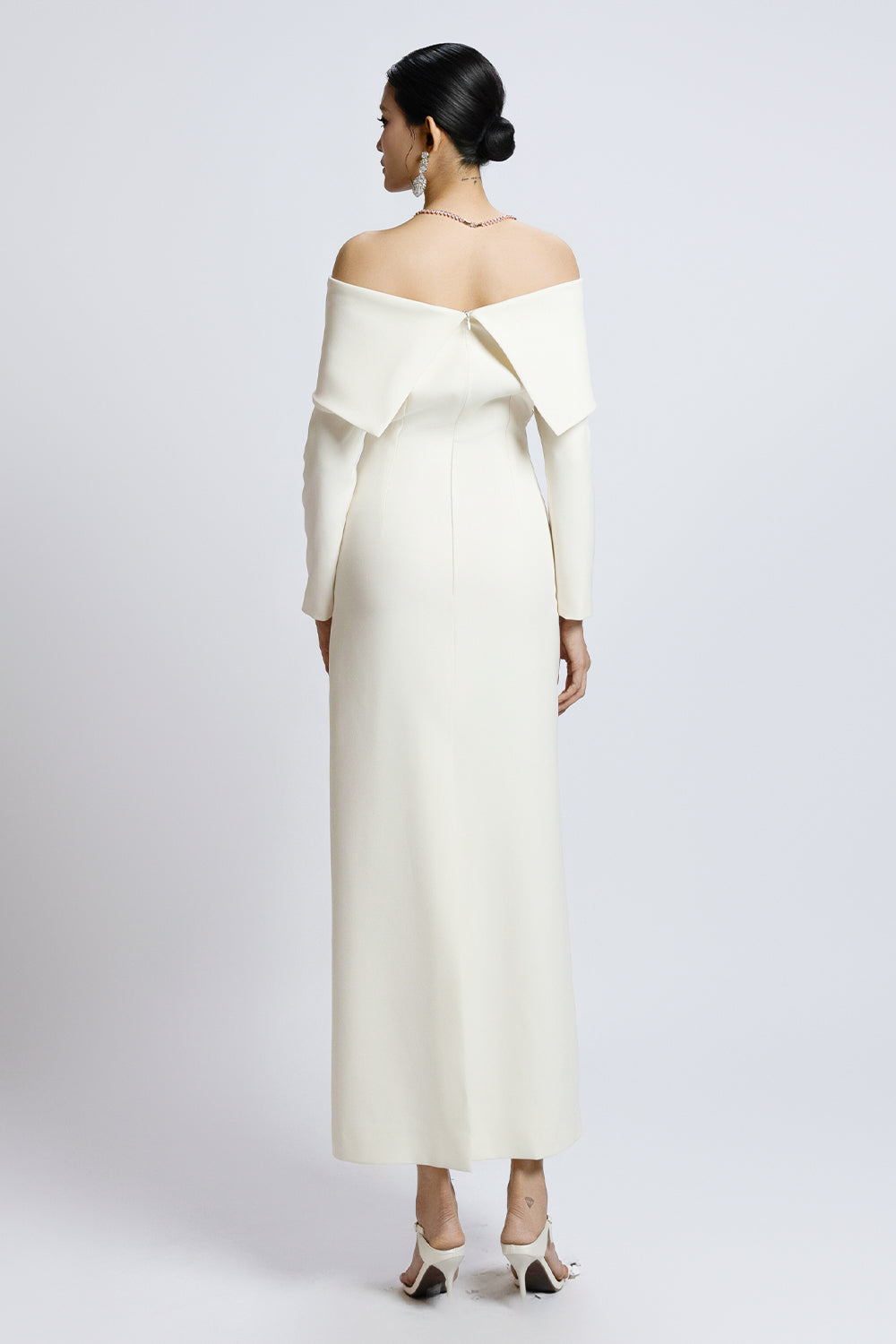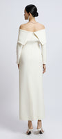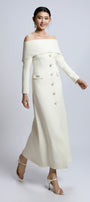 Expertly tailored from premium wool, this off-shoulder sheath midi dress features classic regular sleeves and elegant button embellishments. Designed for sophistication and comfort, it's ideal for cocktail parties, evening gatherings, or formal work events.