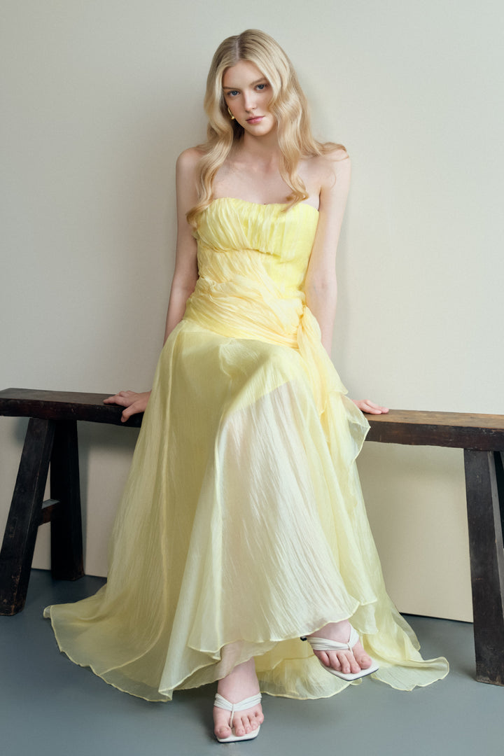 The set features a distinctive asymmetric design with an extended flap on the side, adding a modern architectural element to its silhouette. The gathered bodice, layered skirt enhances the fit and texture, creating a refined and elegant look. Crafted from delicate organza, this set offers a lightweight, airy feel perfect for sophisticated styling. Ideal for those seeking a statement piece that balances structure with softness.