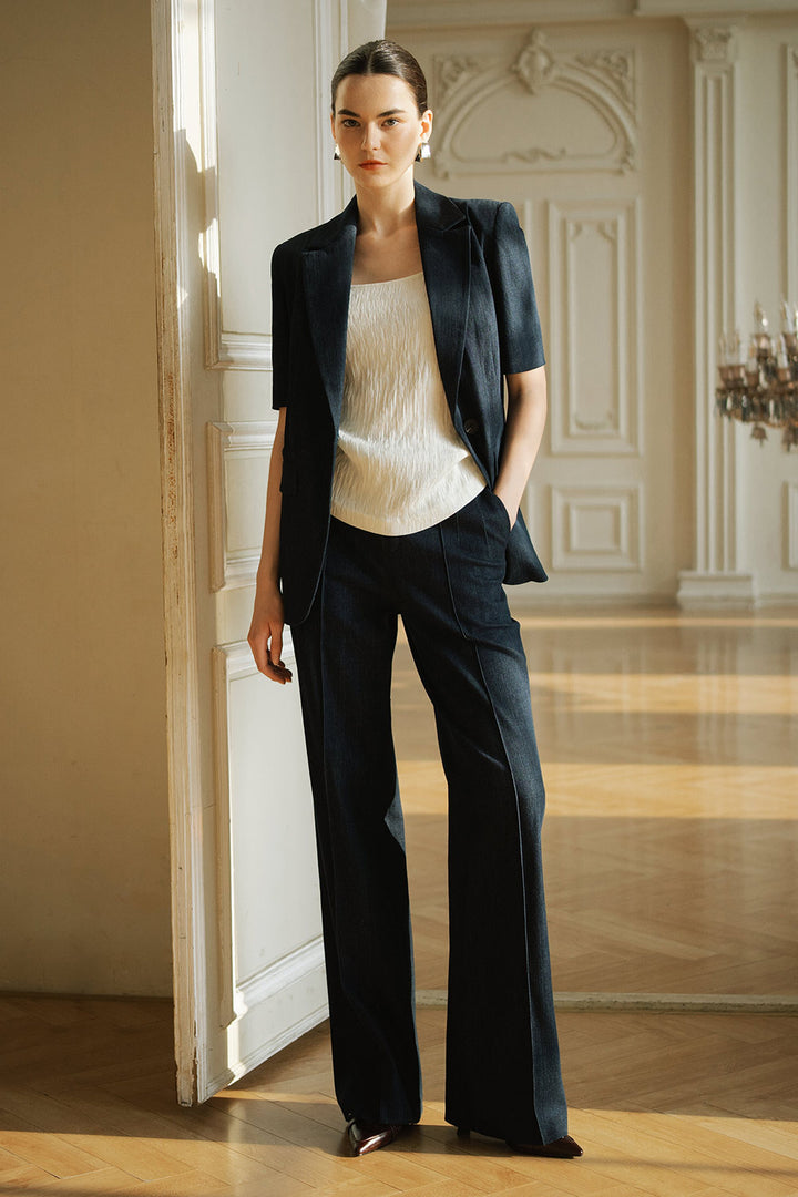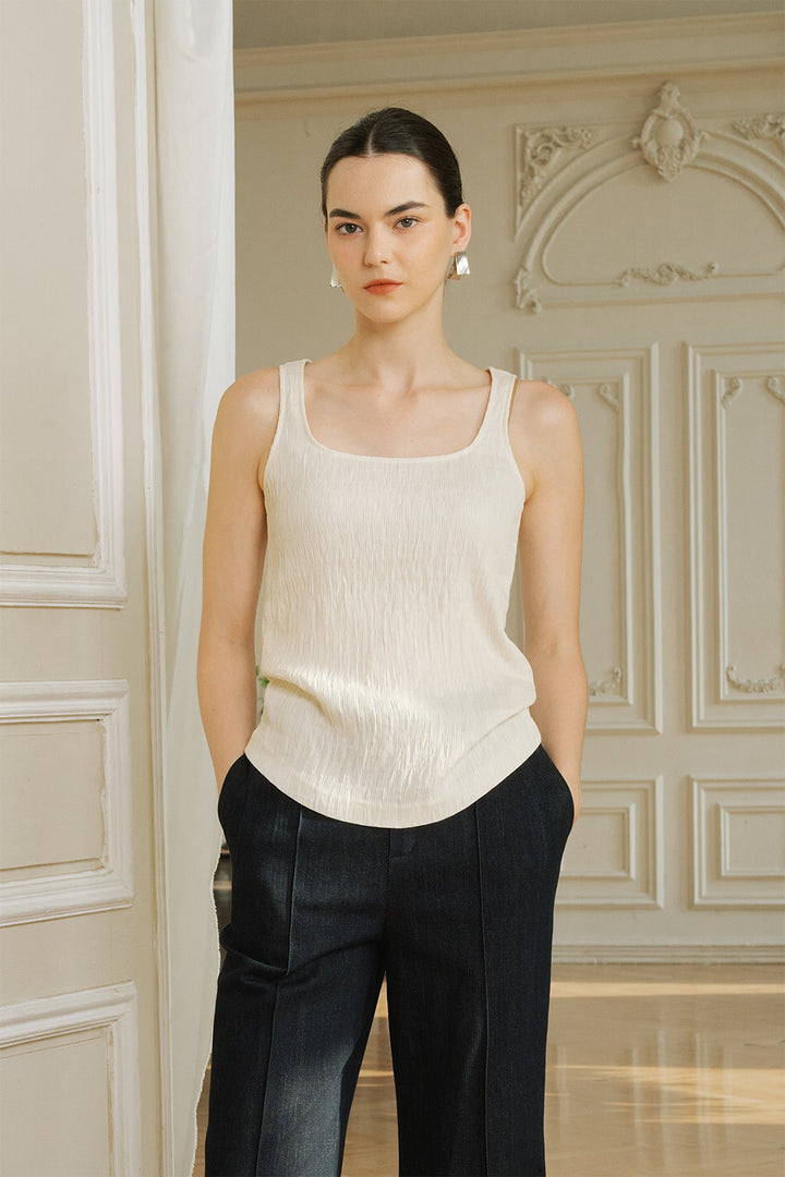The top features meticulously designed linear straps with calculated tension that creates an effortless drape across the shoulders. These architectural elements provide structural interest while maintaining unrestricted movement. The precisely calibrated width and placement of each strap creates a balanced framework that complements the knit body, offering sophisticated versatility for layering or standalone wear.