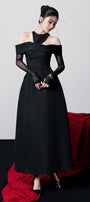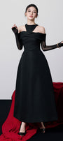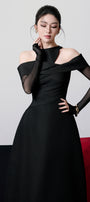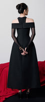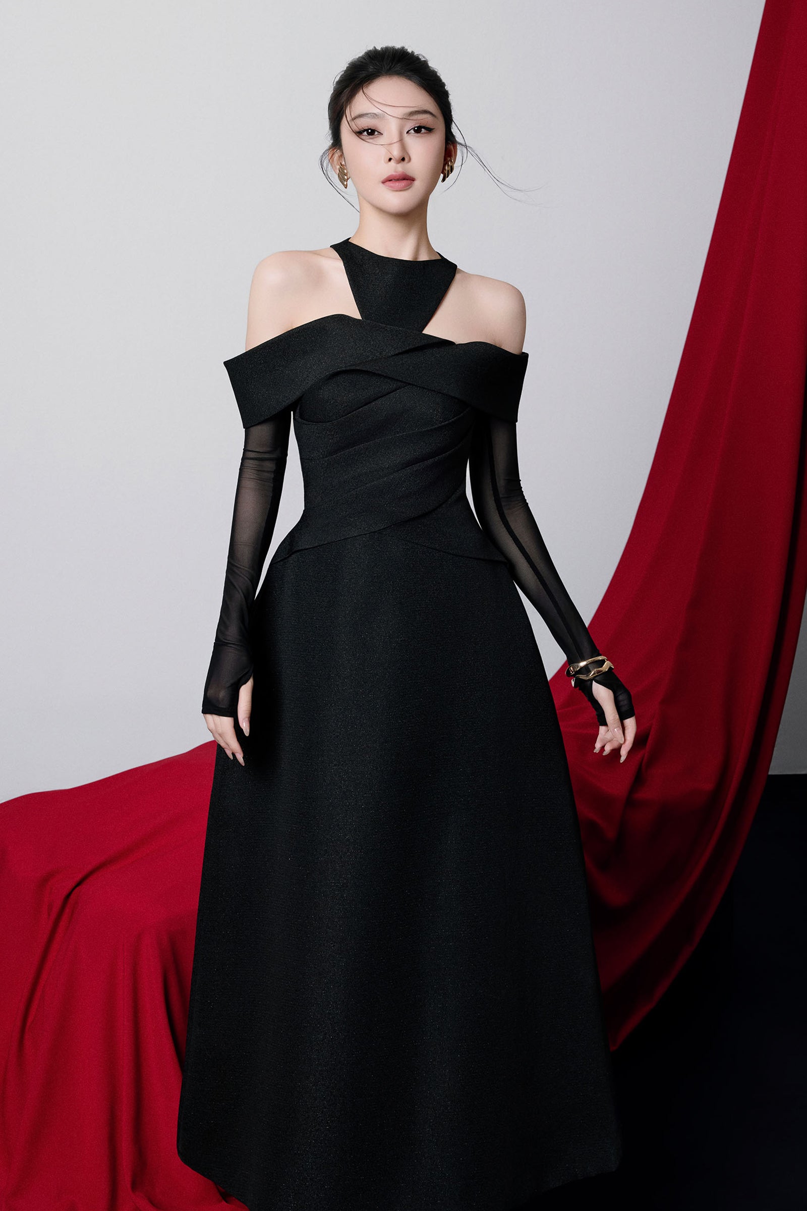 Expertly crafted from luxurious jacquard, this A-line midi dress features a striking halter neck, draped detailing, and cold shoulder sleeves for a refined silhouette. Perfect for upscale gatherings, cocktail parties, or evening soirées.