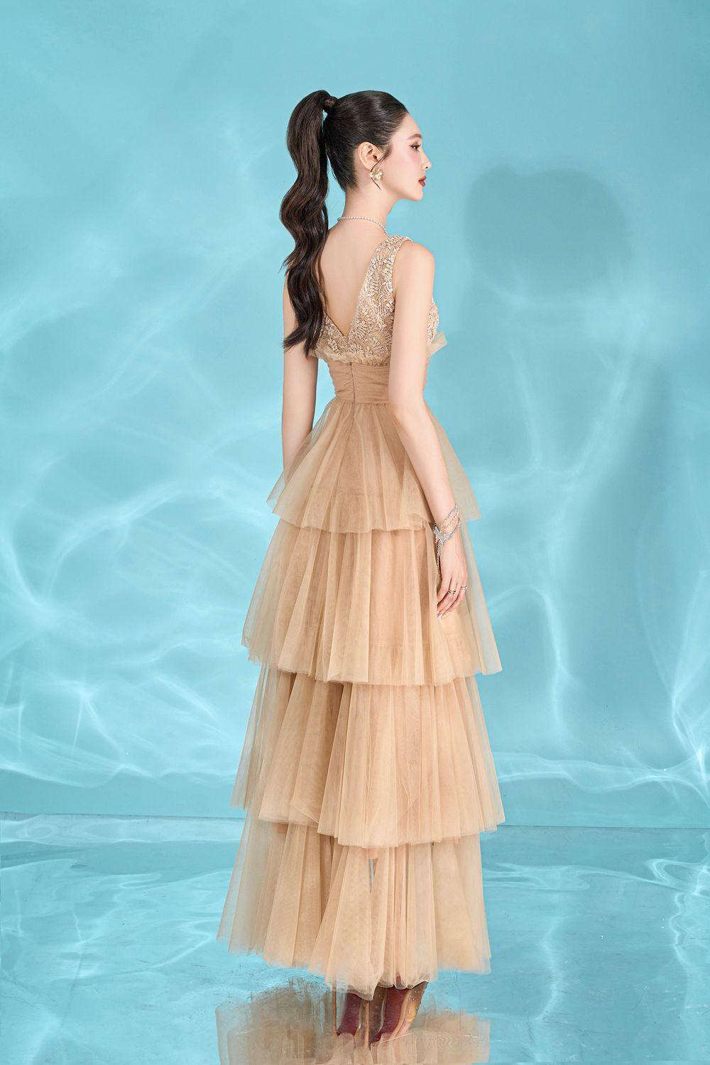 This luxurious dress features a delicate layered design and a flattering v-neckline. Made from high-quality tulle fabric, it flows gracefully to the floor, making you feel elegant and sophisticated. Perfect for any special occasion, this dress exudes luxury and exclusivity.