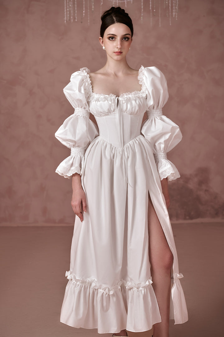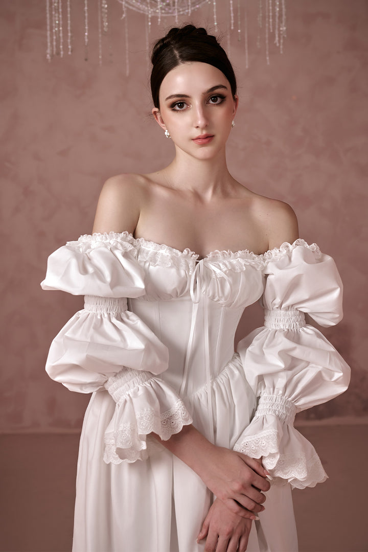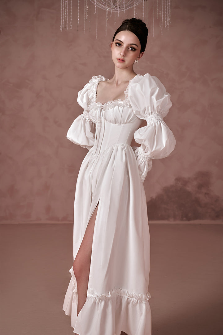 | Special Features | Ruffle trim along neckline, Layered puffy sleeves, Corset design, Drop waist bottom with ruffle trim |