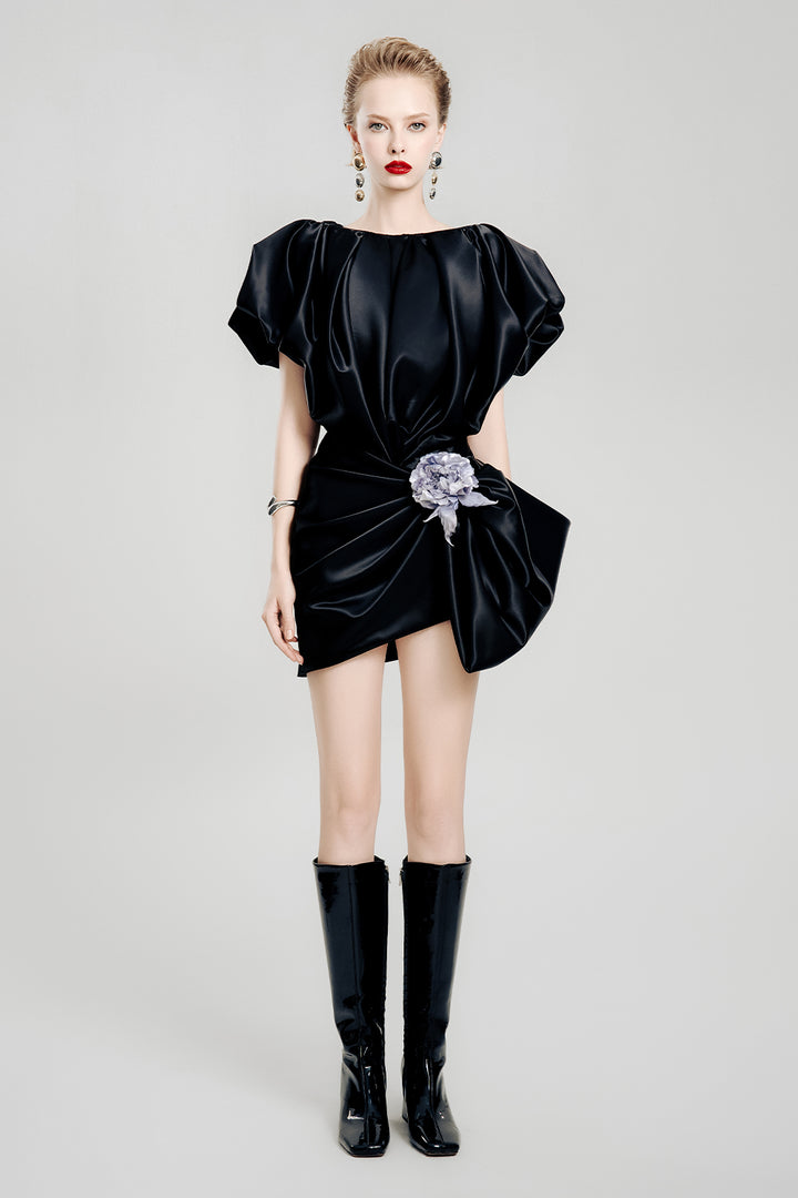 | Special Features | Bubble sleeved, Asymmetric draped skirt with puffy detail |