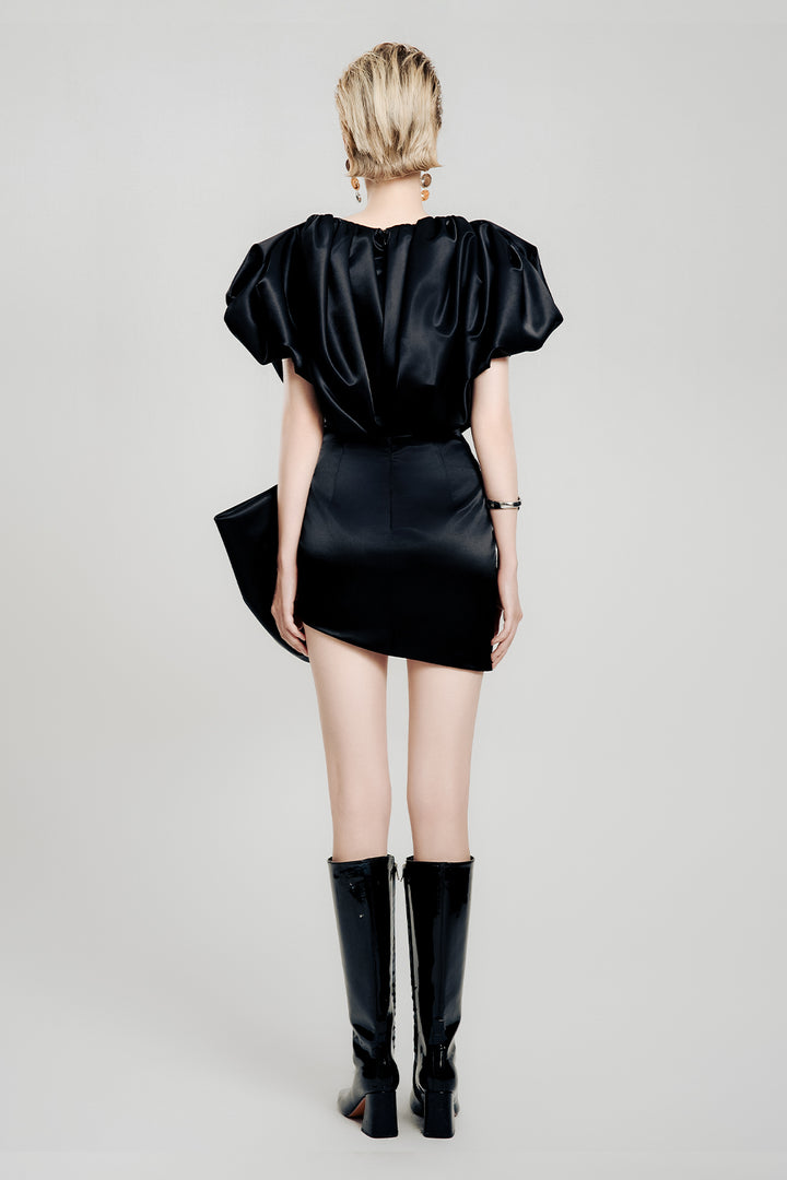 The Dark Petal Asymmetric Puffy Sleeved Satin Mini Dress showcases expert craftsmanship with its striking silhouette and luxurious fabric. Made from smooth satin, this mini dress features an asymmetric neckline paired with voluminous puffy sleeves, creating a bold yet elegant statement. Its tailored fit enhances the figure while the unique design elements add contemporary sophistication, making it ideal for upscale events or stylish evenings.