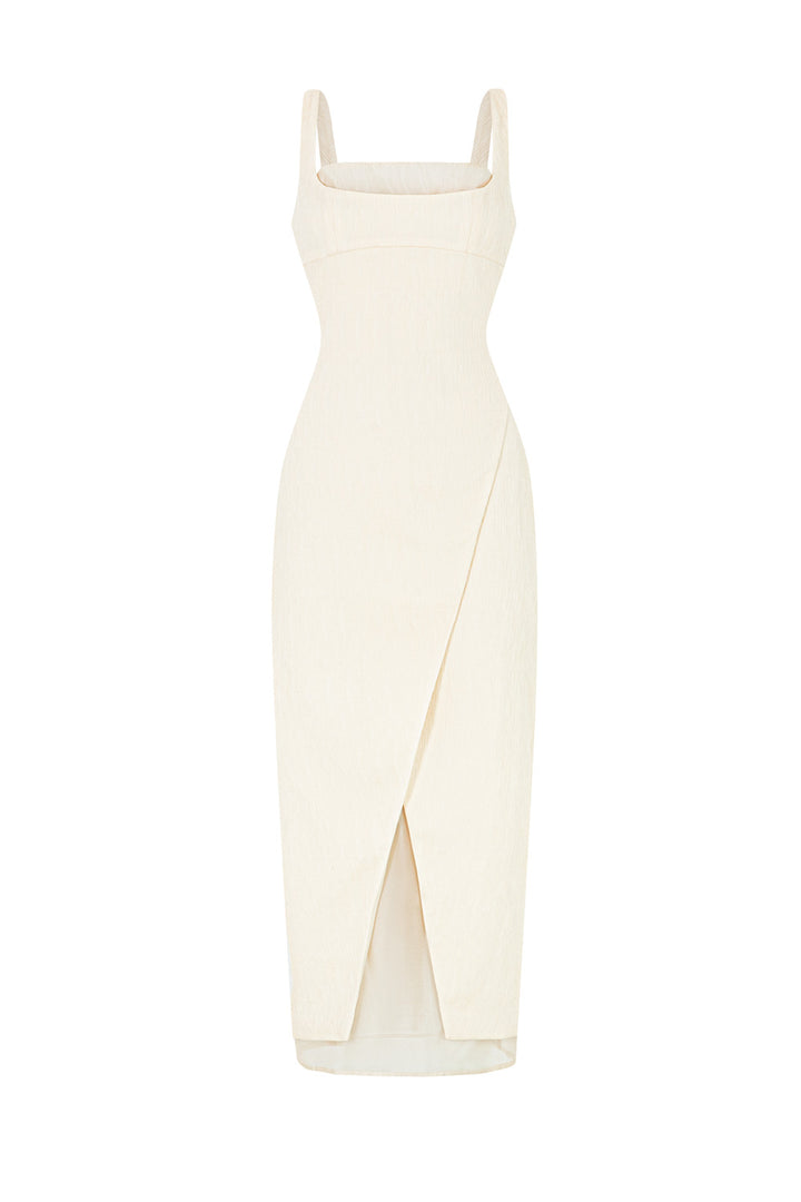 This expertly crafted midi dress features elegant strappy details and a distinctive diagonal flap skirt design. Constructed from lightweight cotton voile, the dresss offers breathable comfort while maintaining a sophisticated silhouette. The strategic diagonal draping creates a flattering asymmetrical look that enhances your natural shape.