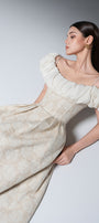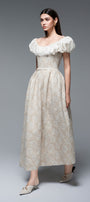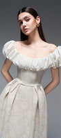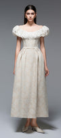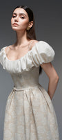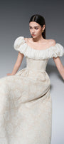 Gathered puffy sleeves, Corset waist design, Pleated waist