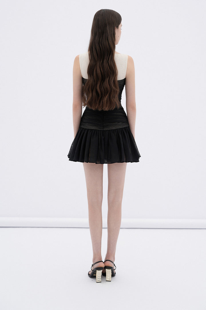 | Special Features | Gathered top design with golden button, Two-color contrast, Ruffle sheer skirt, Inelastic |