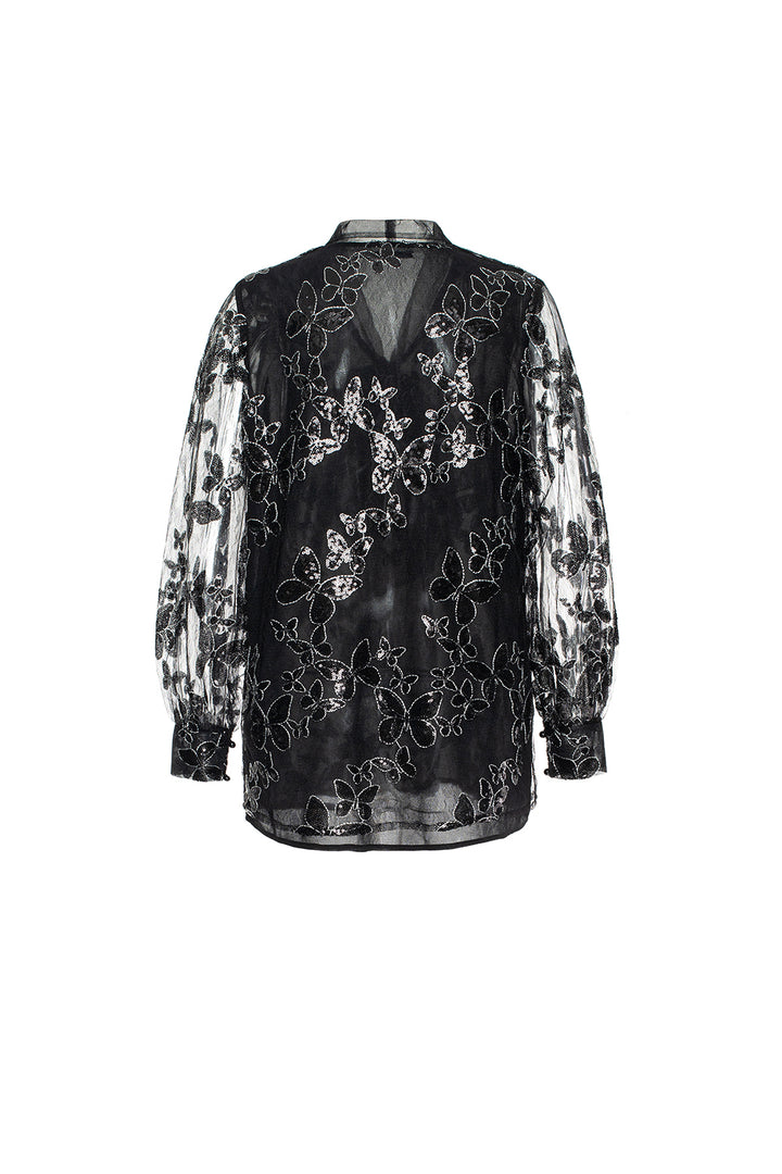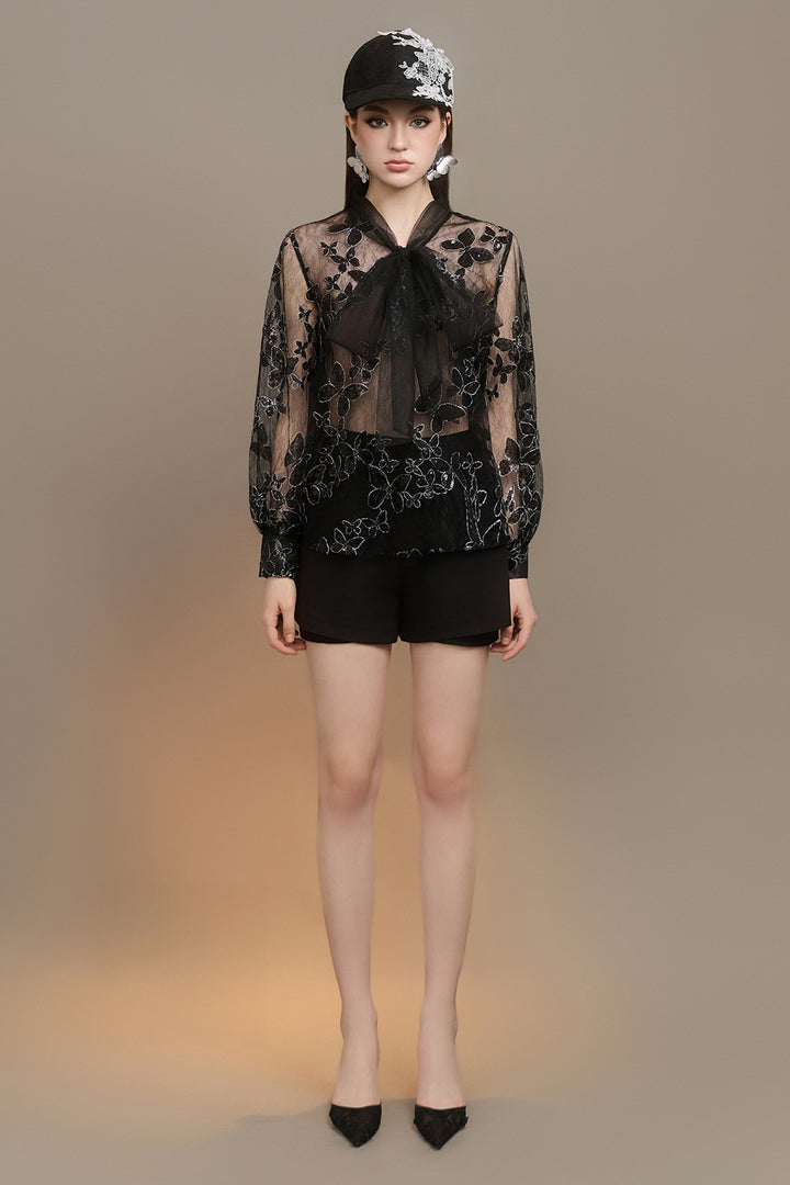 The top features delicate butterfly embroidery on a sheer mesh fabric, combining elegance with subtle allure. Its lightweight, see-through design offers breathable comfort while the tie neck detail adds a refined finishing touch, making it a sophisticated choice for layering or standout styling.