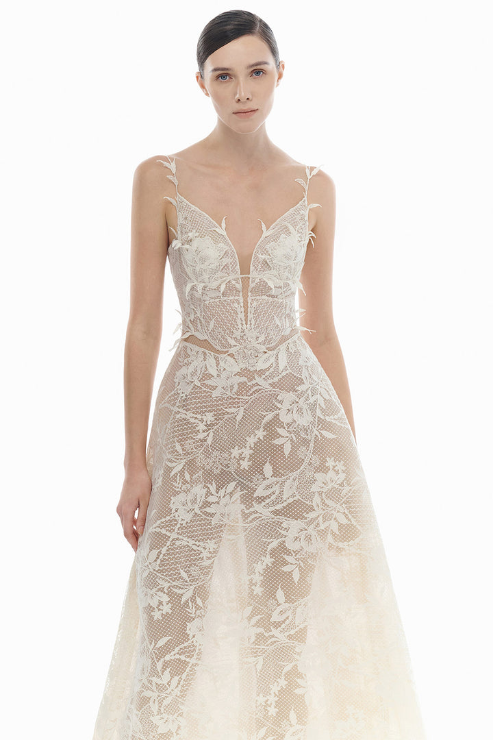 Special Features Deep plunging neck with mesh connected, Leaves embellishments created fringe detail, Cut-out waist with mesh material, Floral lace pattern, Sheer effect, Wavy hem