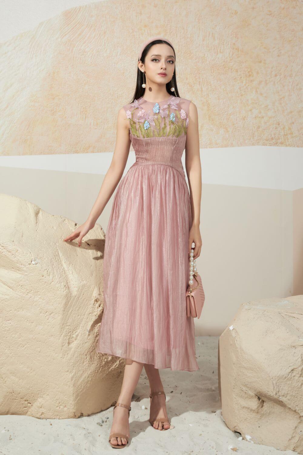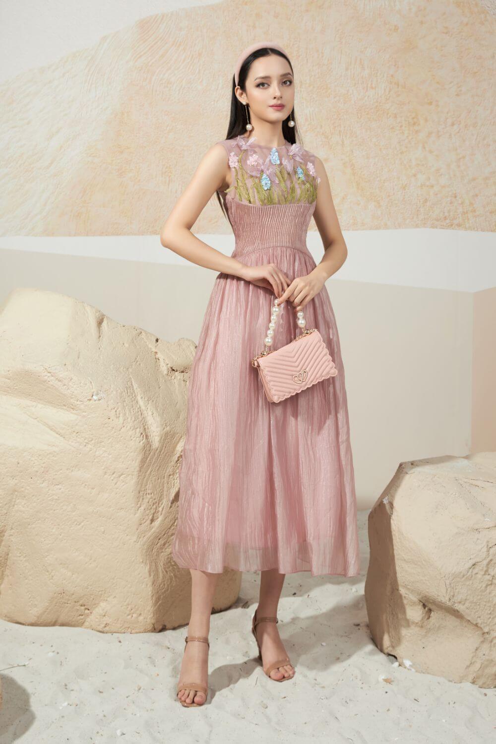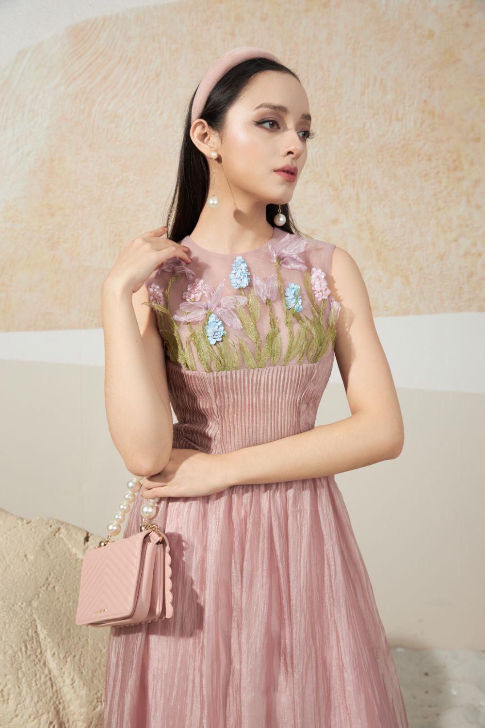 The design uses high-quality silk material and is specially shaped, with modern 3D organza flower embroidery details and meticulous bead details. The highlight of this dress is the waist designed in a corset shape, pleated technique helps to highlight the wearer's body. With silk fabric, the dress creates a floating, flexible in every movement of the wearer.