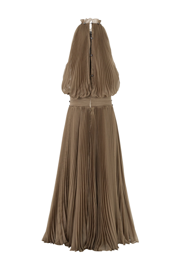 This silk A-line maxi dress showcases expert tailoring with pleated details, a chic halter neck, elegant buttons, and ruffle embellishments. Ideal for formal events, evening parties, or summer celebrations where style and sophistication are essential.