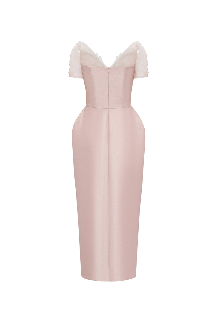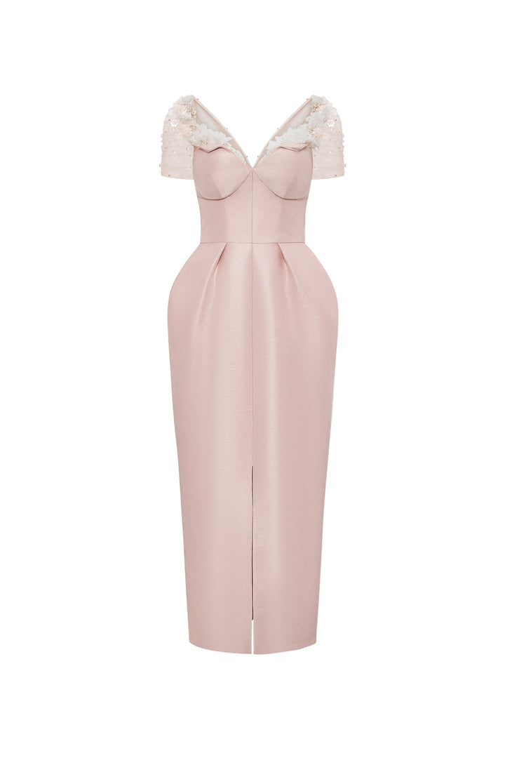 The midi dress features a structured chest cup that enhances silhouette definition, complemented by puffy hips for a flattering shape. Its gathered sheer sleeves with attached floral details add a delicate, sophisticated touch, blending elegance with modern design. Crafted from luxurious taffeta, this midi dress offers both style and refined craftsmanship for standout occasions.