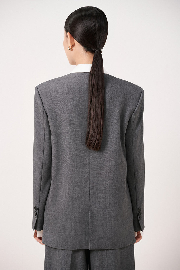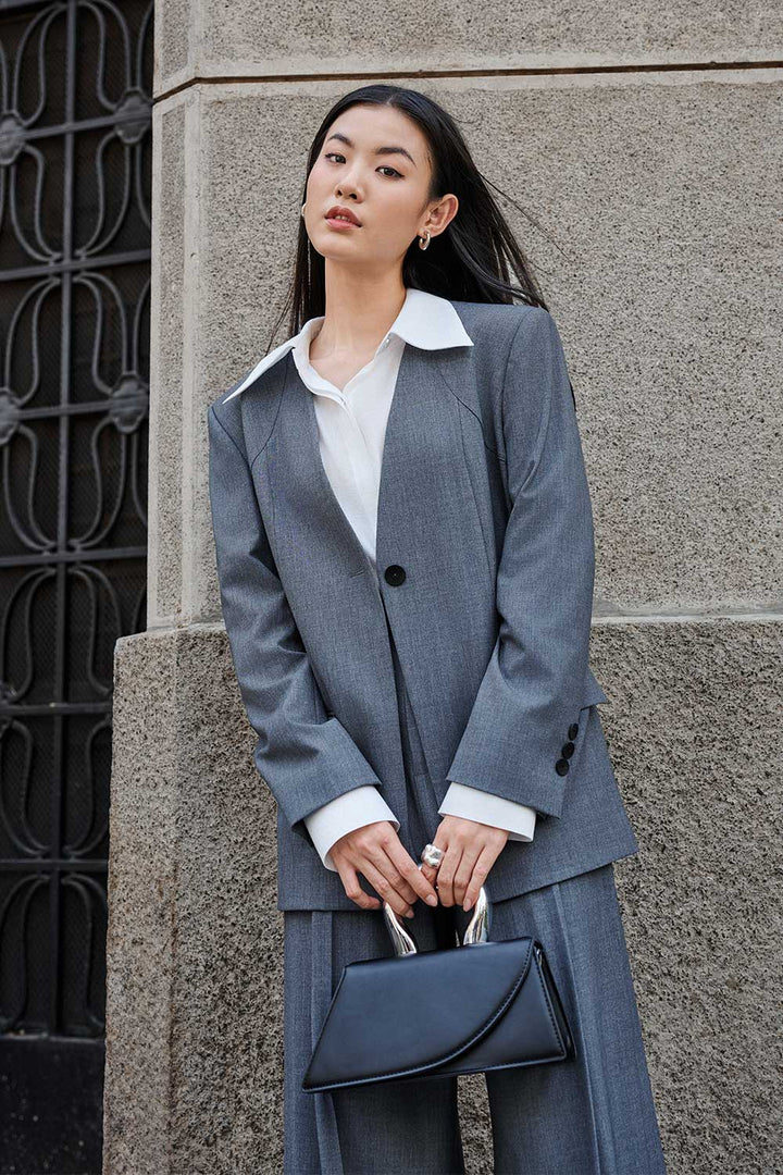 The blazer offers a contemporary silhouette with its clean, minimalist design. The absence of traditional lapels creates a streamlined profile that transitions effortlessly from professional settings to evening events. Crafted from a premium wool blend, this blazer provides excellent structure and warmth while maintaining breathability throughout the day.