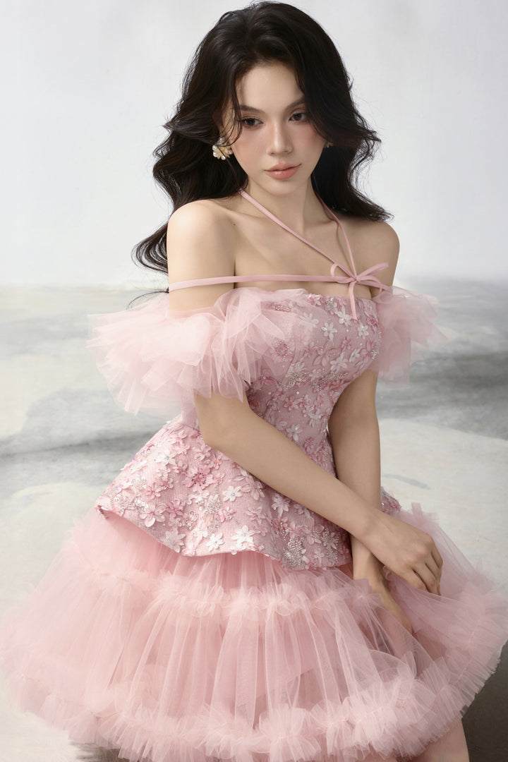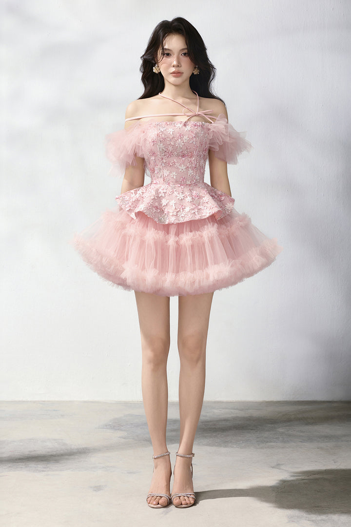 This mini dress features a sophisticated cold-shoulder design with delicate ruffle sleeves and a peplum top adorned with floral accents. Crafted from mesh and taffeta, it combines texture and structure for an elegant silhouette. The shirred skirt adds subtle volume and movement, making it a refined choice for special occasions.