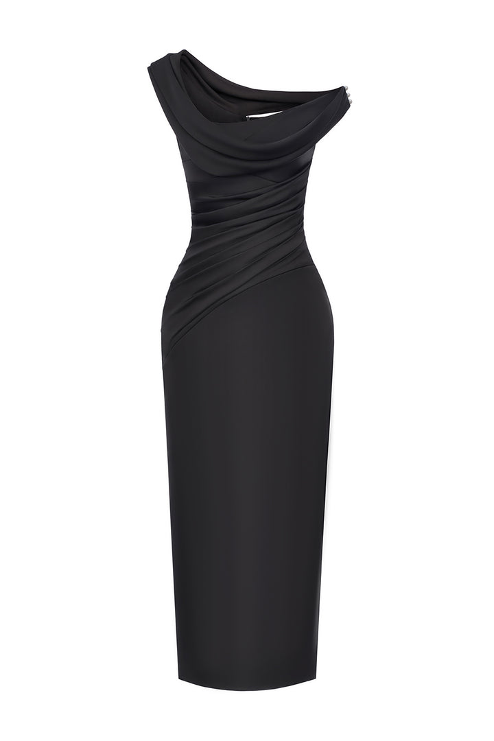 The dress features a sleek sheath silhouette enhanced by a distinctive asymmetric shoulder design. Crafted from smooth poly silk, it offers a subtle sheen and fluid drape that accentuate the body's natural lines. This midi-length dress combines modern architectural detail with expert tailoring, making it an ideal choice for sophisticated events requiring refined style.
