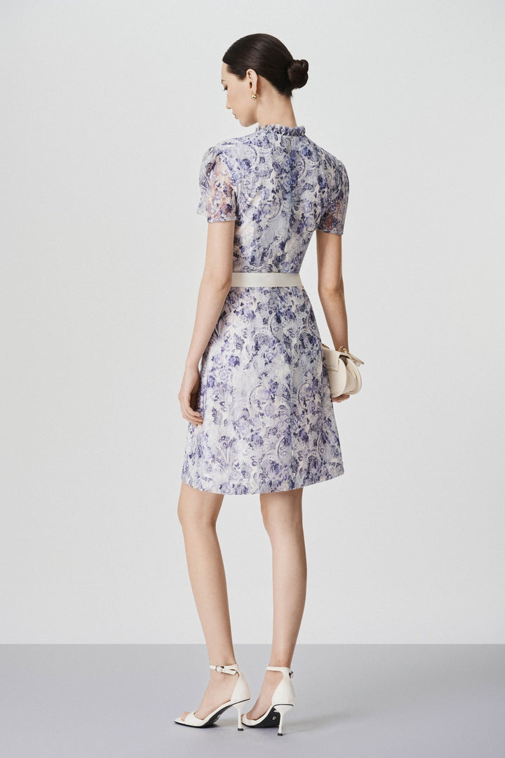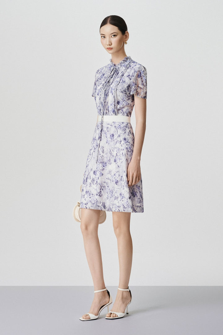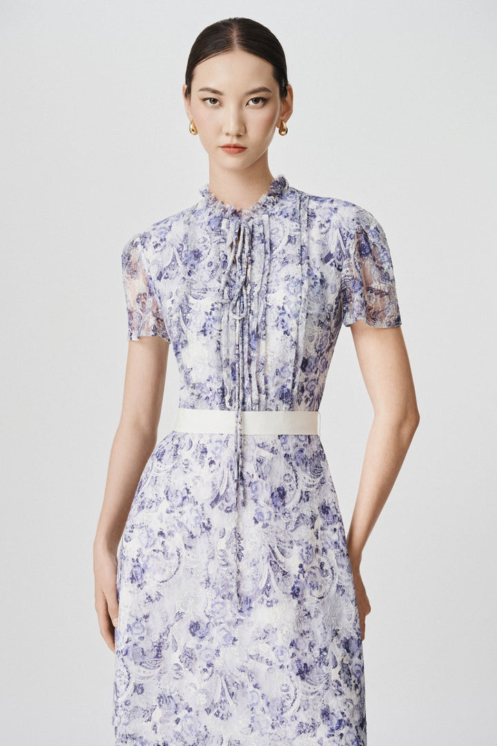 Elevate your style with our dress. The small ruffle neck and string tie add a touch of elegance to the blue floral lace pattern. This dress is perfect for any occasion and will make you stand out with its unique design.