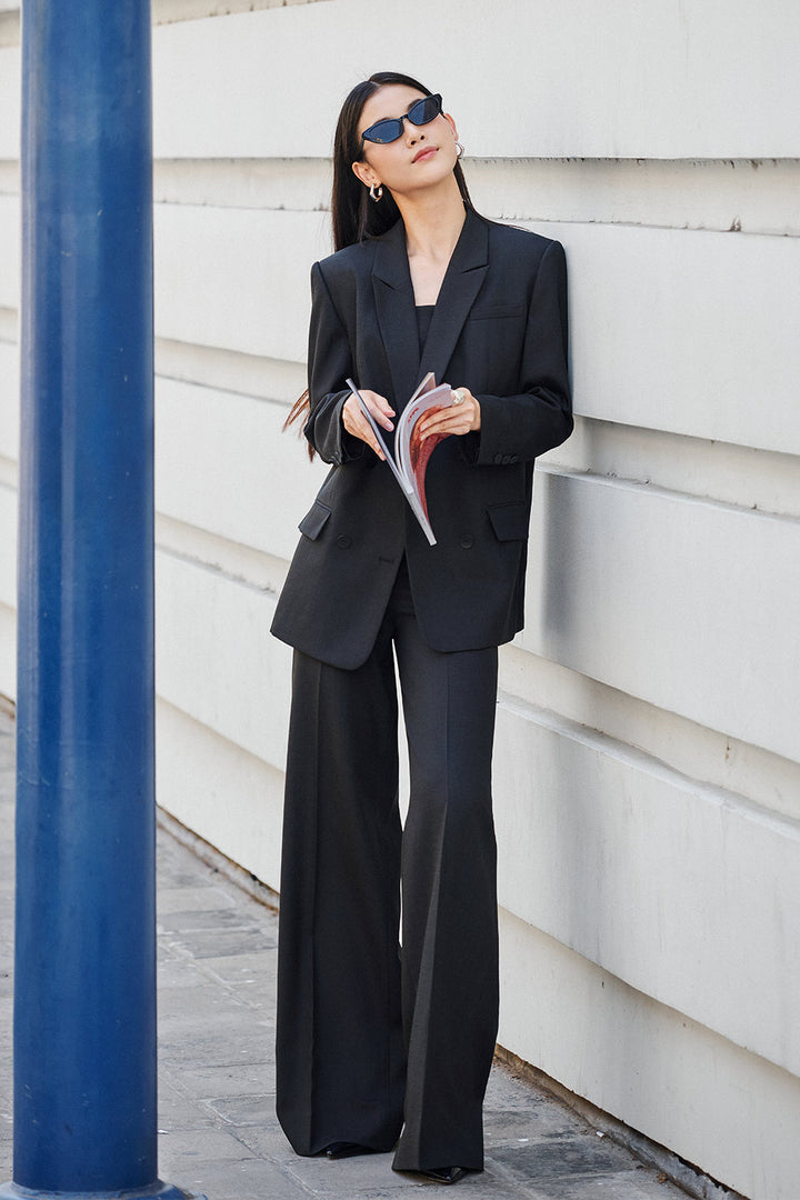 The blazer combines architectural precision with luxurious fabrication. The distinctive peak lapel creates a sophisticated, elongating effect while the straight silhouette offers a clean, structured profile. Crafted from premium twinkle taffeta, this blazer provides subtle luminosity and dimensional texture that elevates professional attire. The meticulous construction ensures proper drape and shape retention, making it a statement investment piece for refined wardrobes.