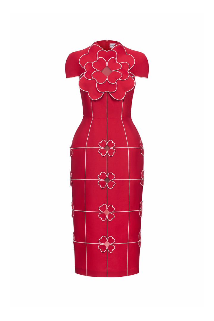 The dress combines a sleek pencil silhouette with intricate 3D floral appliques for a refined, textured look. Its signature shoulder-mounted clam sleeves add architectural interest and elevate the dress’s elegant profile. Crafted from smooth taffeta, this midi dress offers a tailored fit that accentuates the figure, making it an ideal choice for sophisticated occasions demanding both style and craftsmanship.