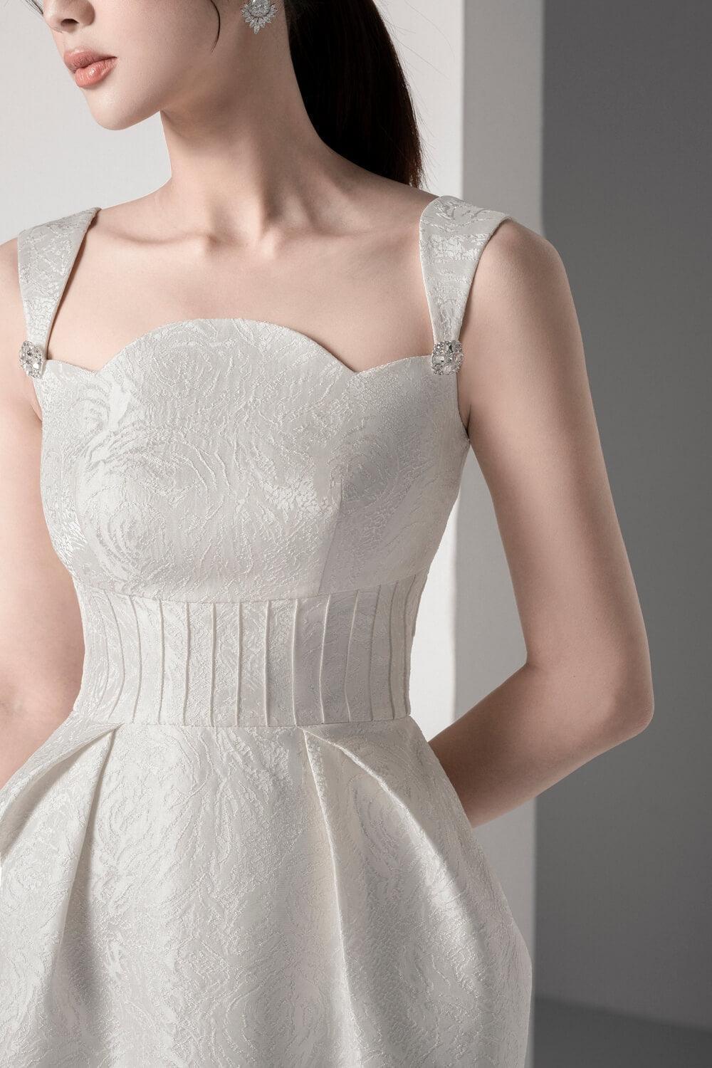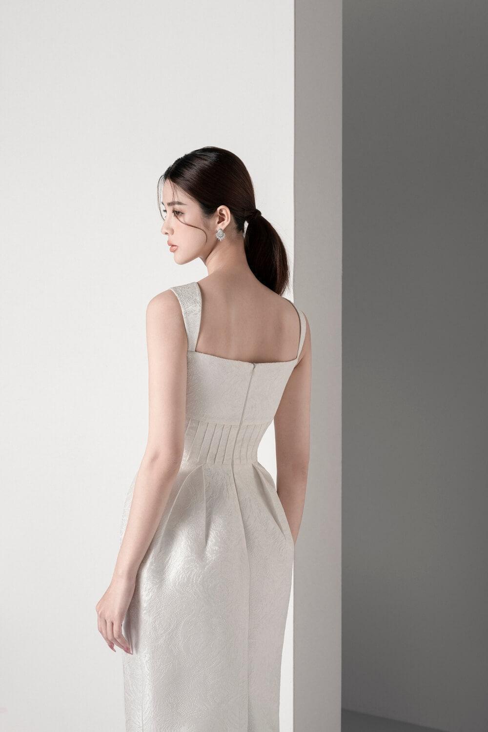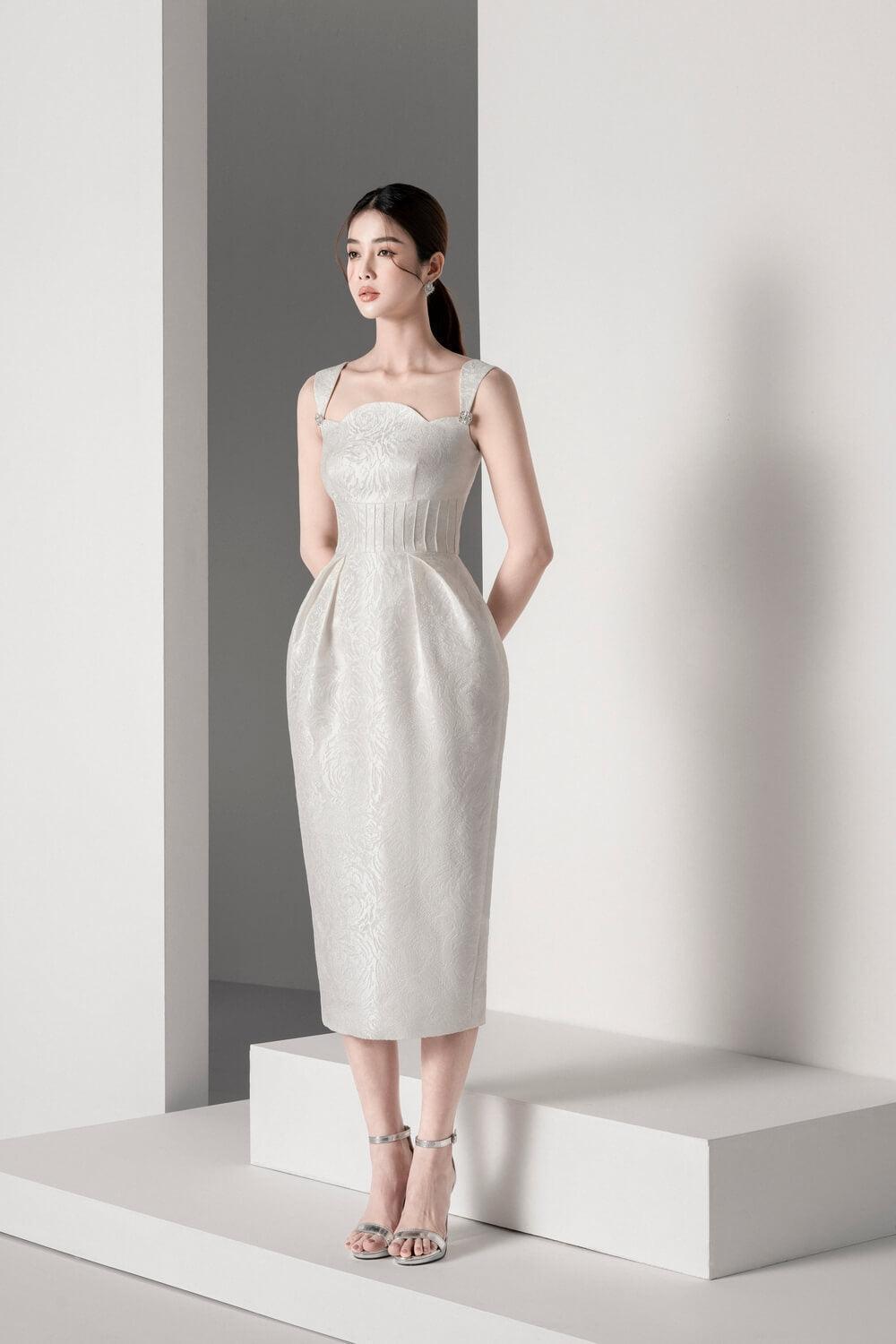 Elegance and gracefulness are expressed impressively in a unique design when combining a pegged skirt and floral patterns. A strappy design is adorned delicately with sparkling stone making the dress more nobility and gorgeous than ever.