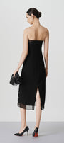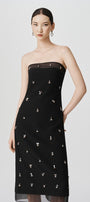 The midi dress expertly combines style and functionality. Its strapless design is both elegant and modern, while the intricate beadwork adds a touch of sophistication. Featuring two layers of high-quality wool and organza, this dress is both comfortable and durable. Perfect for any special occasion, this dress is sure to impress.