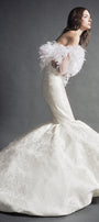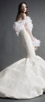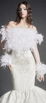 Exude sophistication in this off-shoulder mermaid maxi dress, crafted from luxurious brocade and adorned with elegant embroidery and feather embellishments. Ideal for galas, evening events, and upscale celebrations.