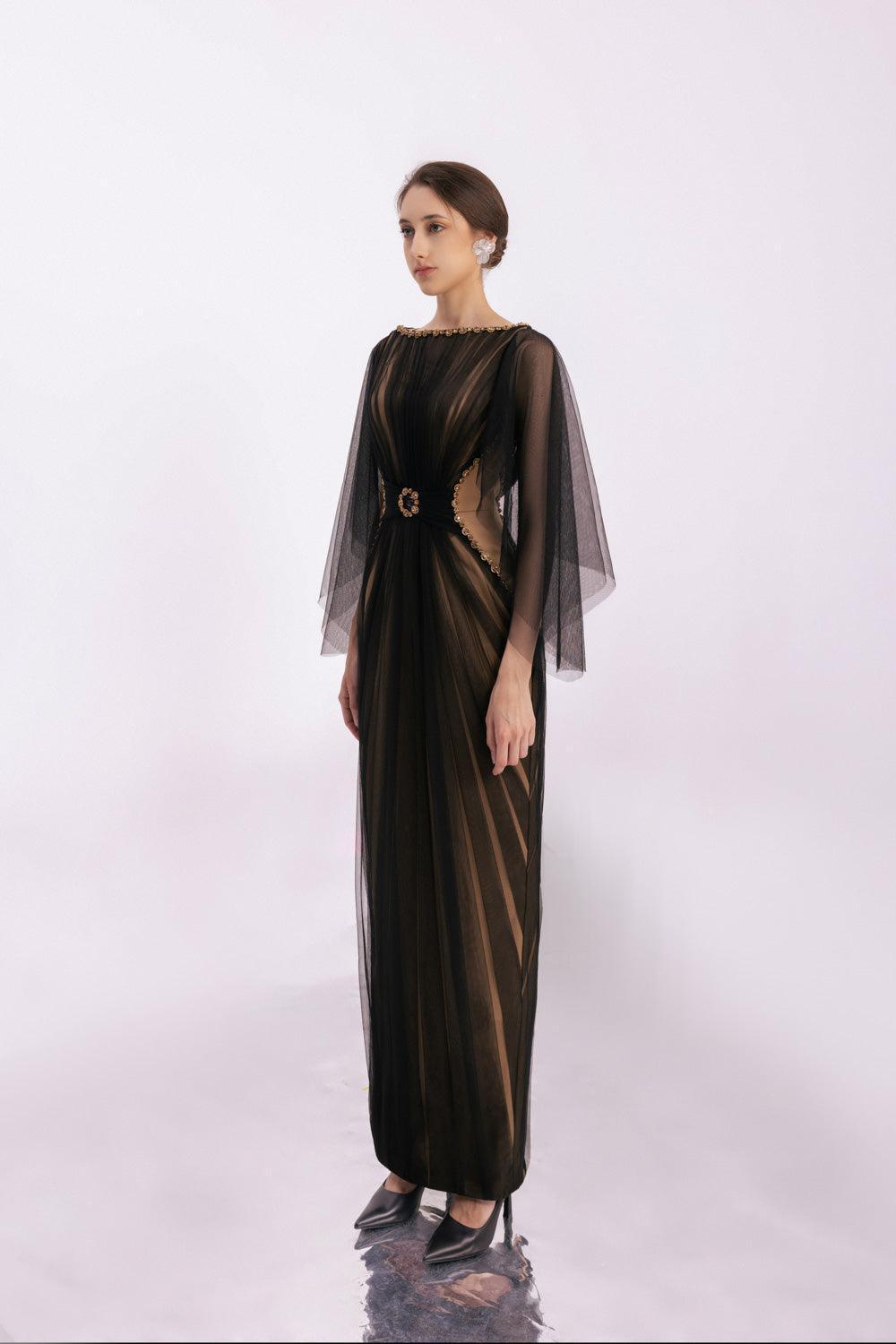 Crafted from exquisite silk, this dress features an elegant boat neck and delicate mesh detailing. Designed to hug your curves, it exudes sophistication and exclusivity. Perfect for any special occasion.