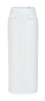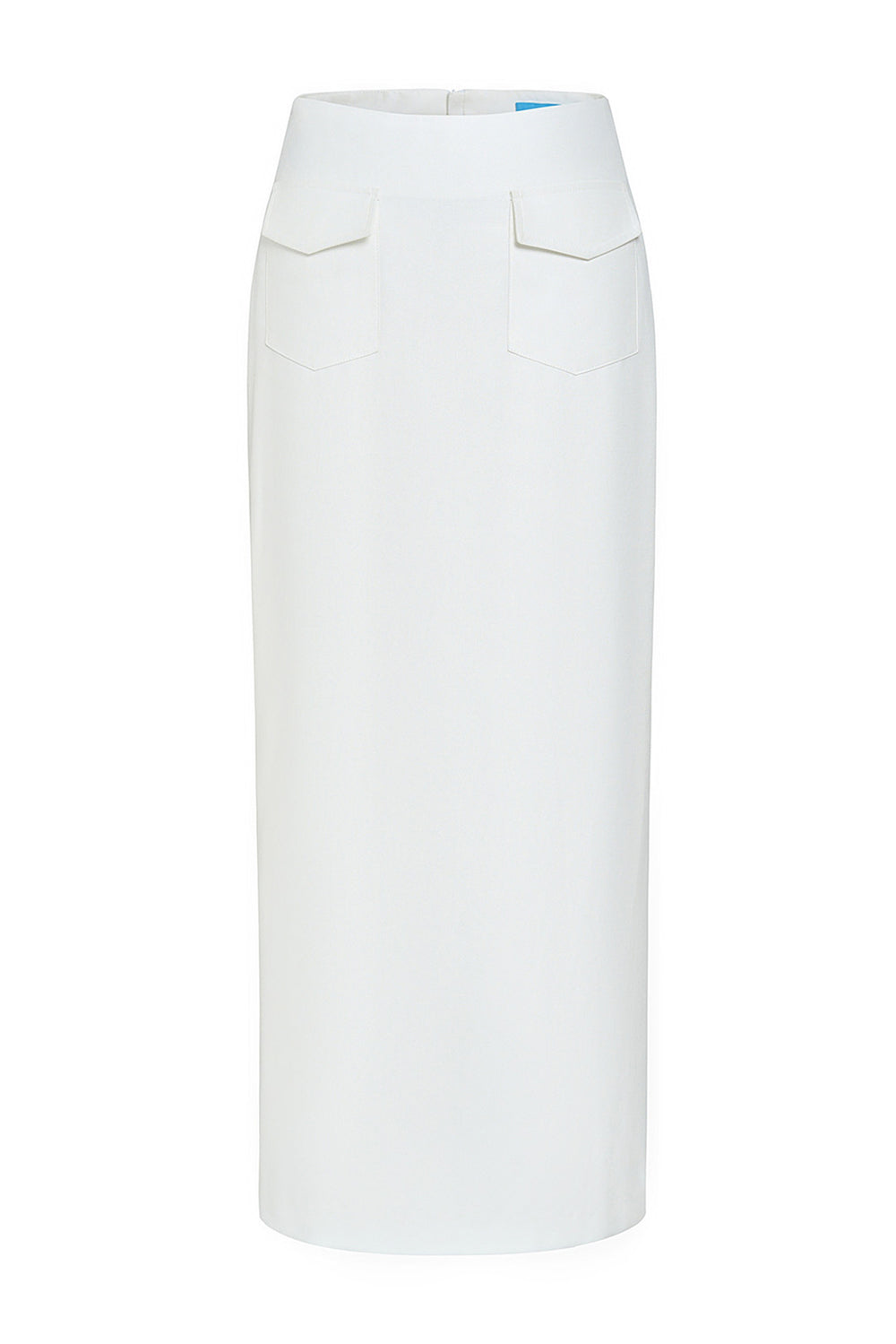 The midi skirt features a clean, tailored silhouette with straight, symmetric flap pockets that add both style and practicality. Designed with a side slit, this skirt offers ease of movement while maintaining a polished, professional look. Crafted from durable twill fabric, it balances structure and comfort, making it an ideal choice for versatile, expert-level wardrobe styling.