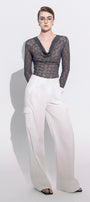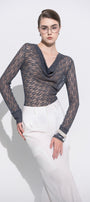 The top features a sophisticated cowl neckline that drapes elegantly, paired with delicate lace detailing for a refined texture. Its cuff sleeves add a tailored finish, enhancing both comfort and style. This top combines form-fitting design with intricate craftsmanship, making it an ideal choice for polished, contemporary looks.