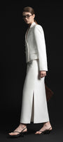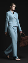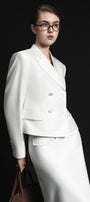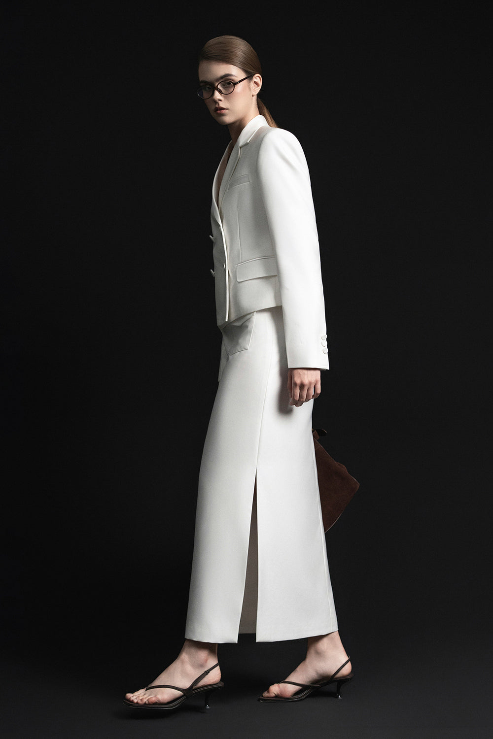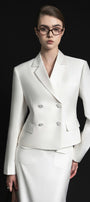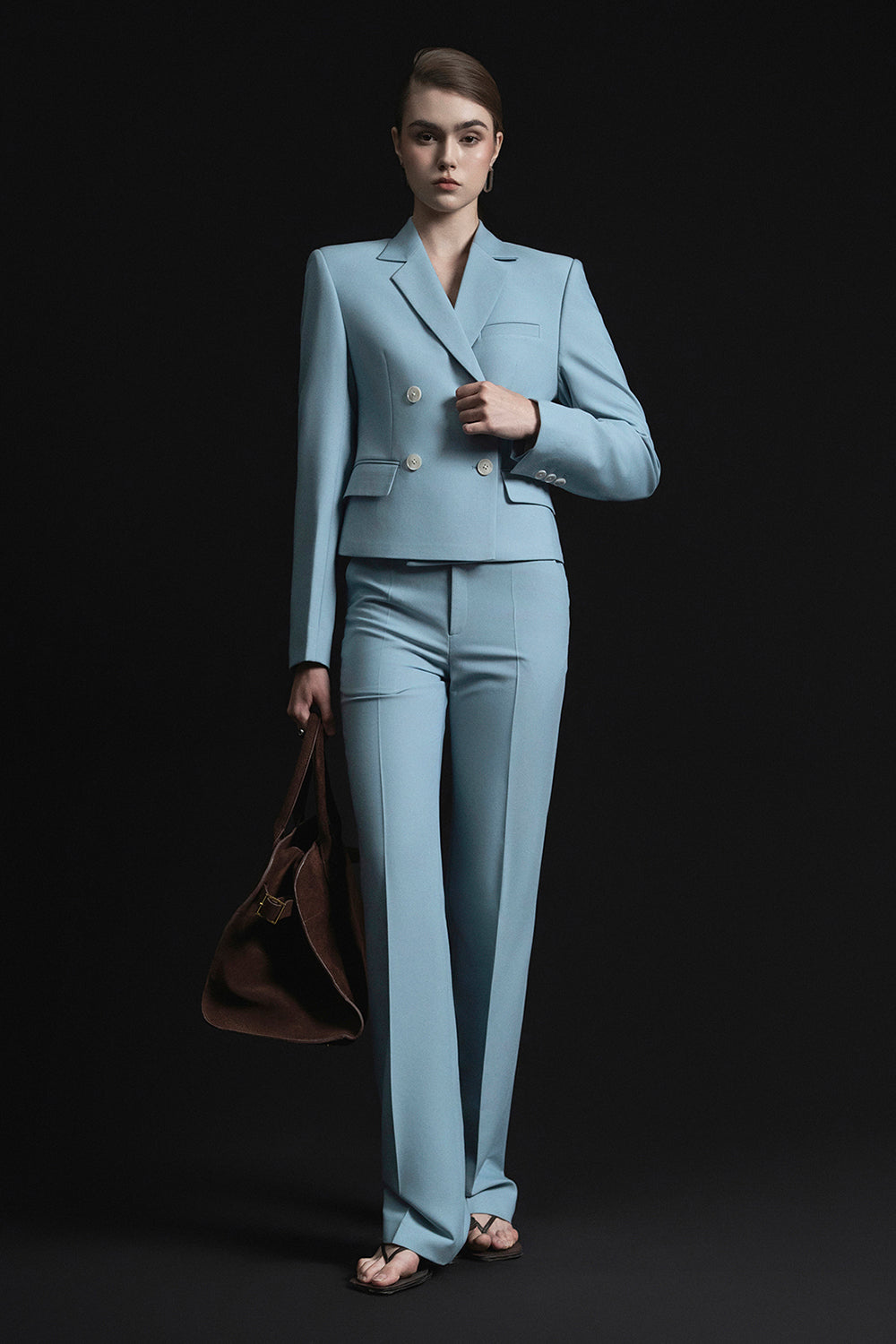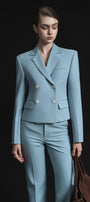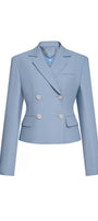 This jacket features a tailored cropped fit with a classic double-breasted front and a sharp notch lapel. Crafted from durable twill fabric, it offers structured style and versatility, perfect for elevating both professional and casual looks with a modern edge.