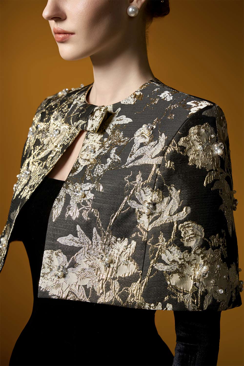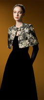 This dress features a flattering ball gown silhouette and elegant cape shoulder design. Made with luxurious velvet fabric, it offers a sophisticated look perfect for formal occasions. The cape adds a touch of drama while the floor length hemline elongates the body for a statuesque look.