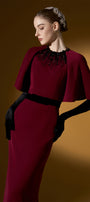 Special Features: Attached crystals along the neck line, Wavy flare sleeves, Detachable velvet belt with bow, Hidden back zipper, High slit back, Waist dart
