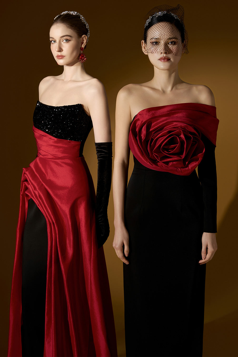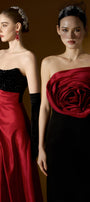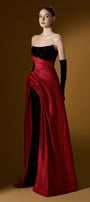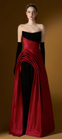 Attached crystals on the chest, Diagonal pleated waist, Asymmetric draped taffeta skirt