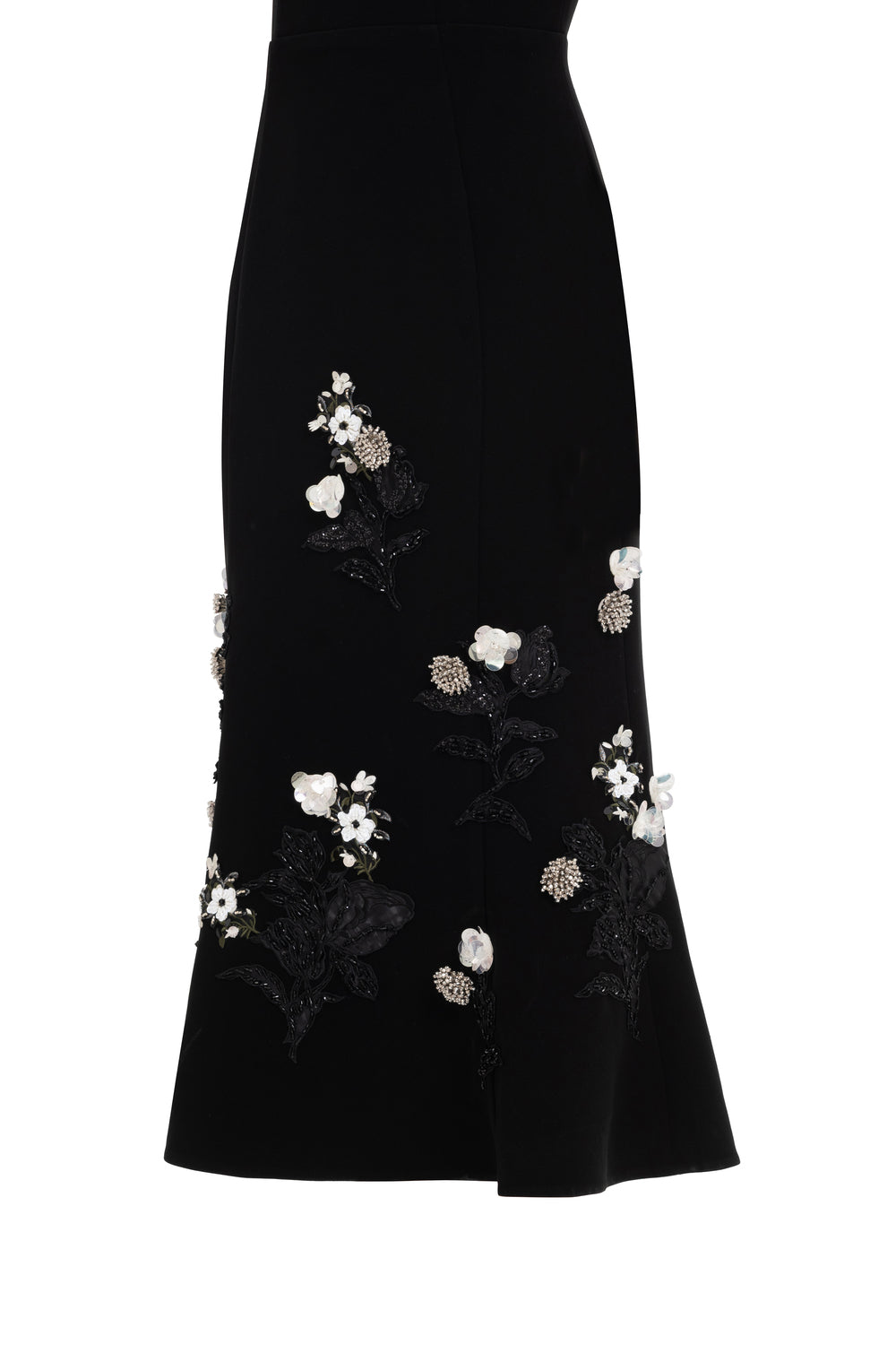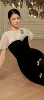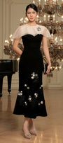 This midi dress features a sophisticated mermaid silhouette that enhances your natural curves. Crafted from luxurious velvet, it offers a smooth, elegant drape. The standout cape shoulder design adds a dramatic flair, while delicate floral bead embroidery provides intricate detailing for a refined finish. Perfect for formal occasions, this dress combines timeless style with expert craftsmanship.