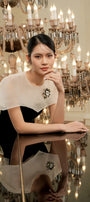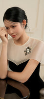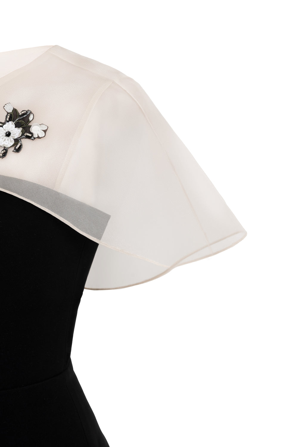 Special Features: Mixed organza cape sleeve, Beads and floral embroidery, Dart lines