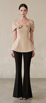 Expertly crafted from cotton, this off-shoulder peplum top features elegant draped detailing and regular sleeves for a sophisticated silhouette. Ideal for brunches, garden parties, or casual chic gatherings where effortless elegance is appreciated.