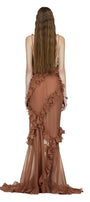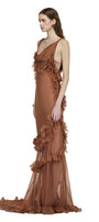 Showcase effortless sophistication with this sheath maxi dress, featuring a graceful cowl neck and delicate ruffle embellishments. Ideal for weddings, cocktail parties, or elegant evening events where refined style is essential.