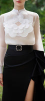 Special Features: Embroidered 3D flower on the chest, Attached beads along the sleeves, Sheer effect